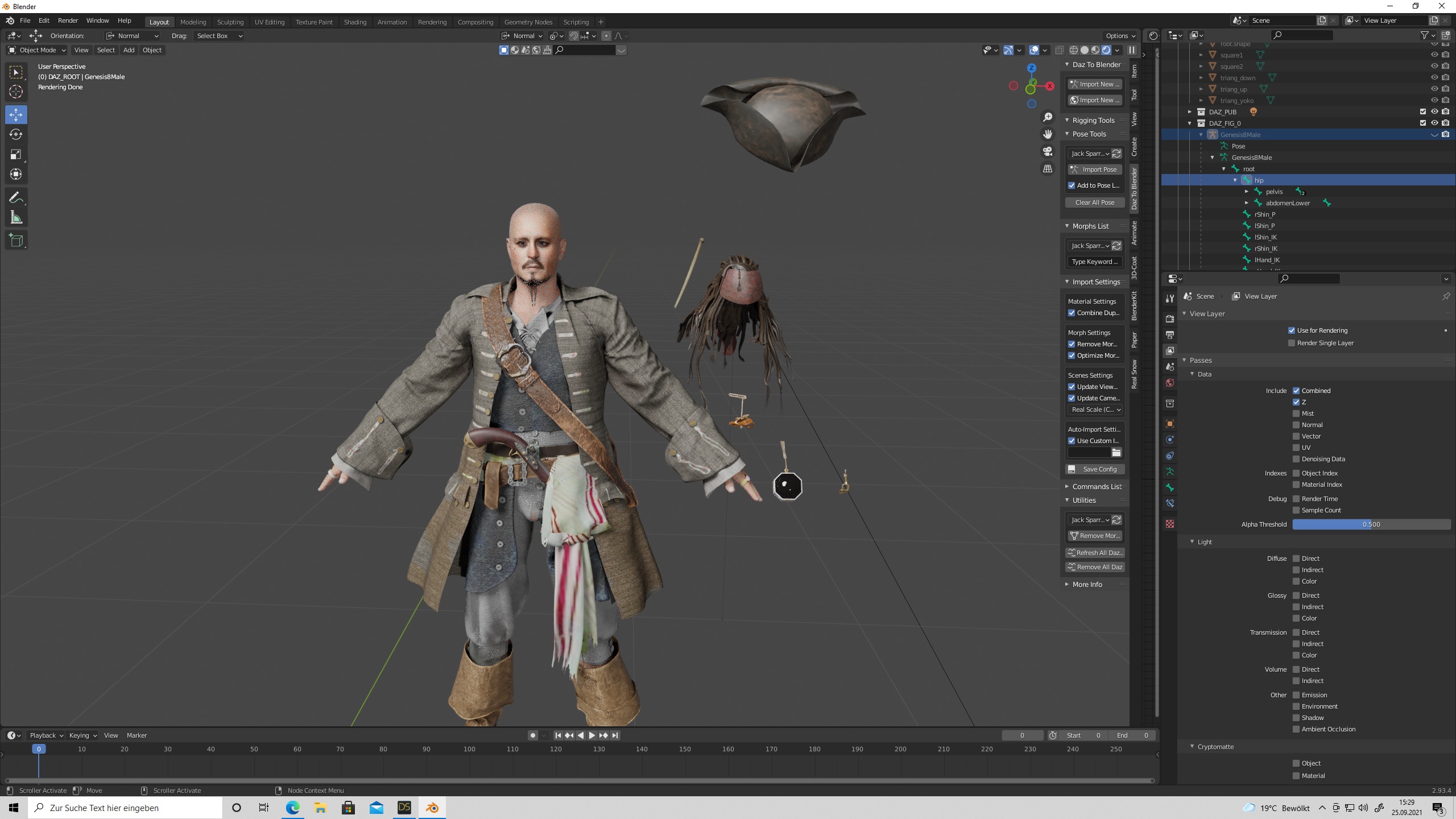 Ich importiere dank der Daz Brigde nach Blender und die Figur ist da mitsamt Texturen und die gefitteteten Kleidungen sitzen klasse ,aber alles was ich an der Figur angechanged habe wie zb der Hut,die Haare, etliche Props wie Kompass ,Pistole ,sein Hut etc....schweben daneben rum.