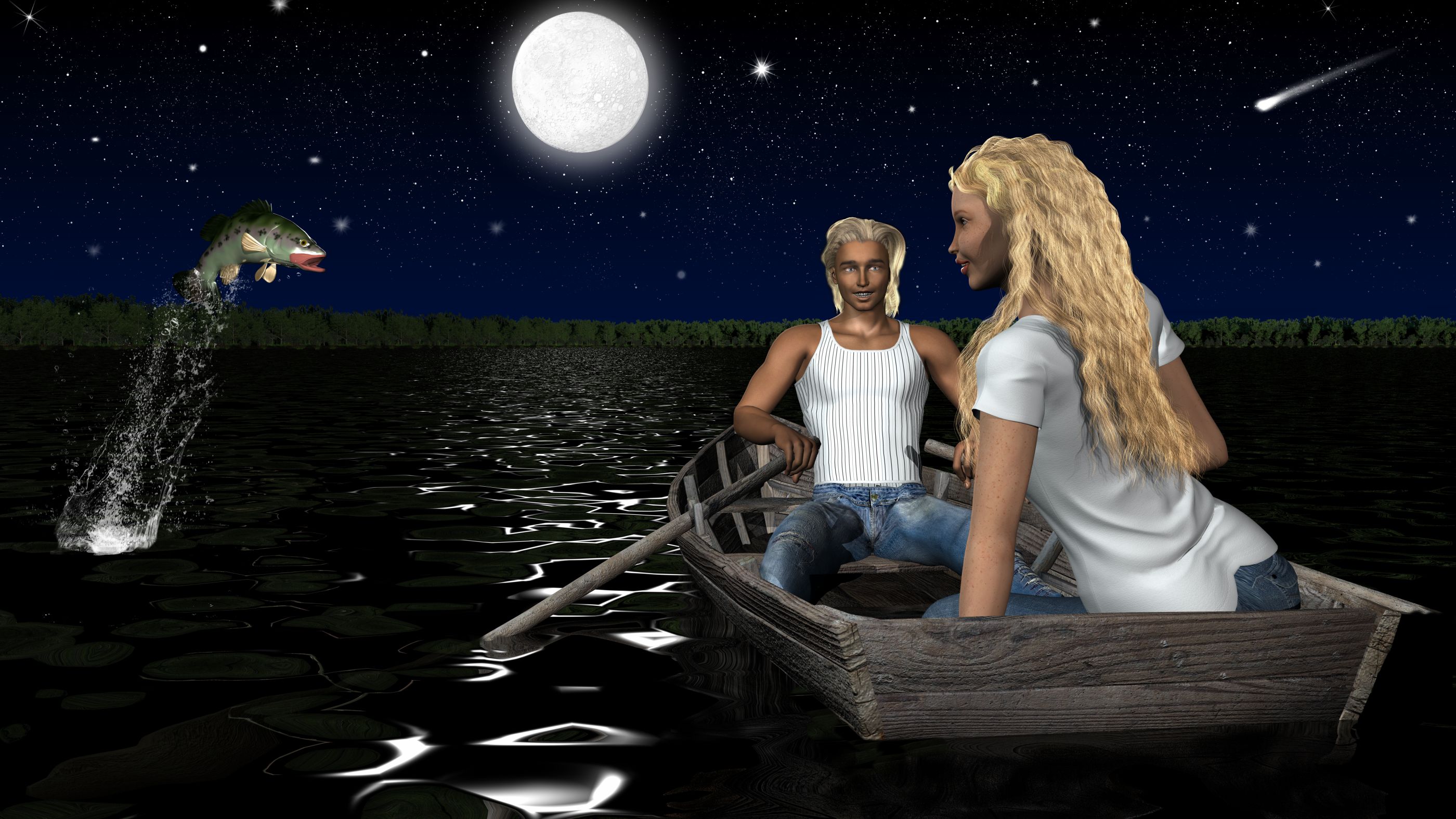 Erstellt in CARRARA. Diesmal sind fast alles gekaufte Objekte, nur den Waldrand habe ich aus echten Waldrand-Fotos zusammen gesetzt. Das Ruderboot ist im Inneren noch relativ trocken; ich habe das mit zwei Render erreicht, die ich mittels Layer-Arbeit in Photo-AFFINITY zusammen gesetzt habe.