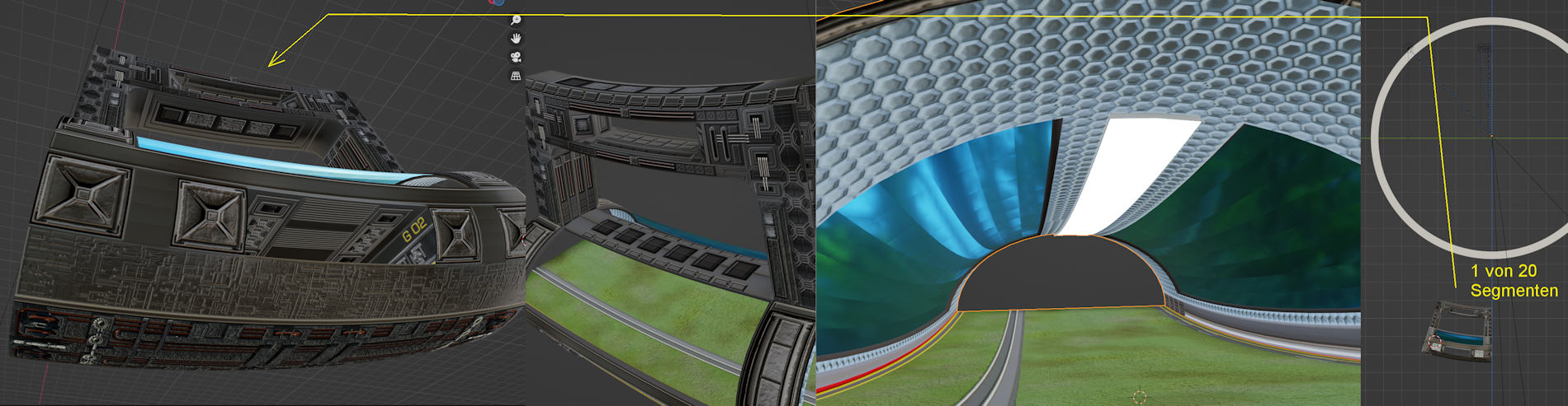Nachdem ich jetzt ein bischen mehr Zeit habe, werde ich mal anfangen, die ganzen Objektleichen so step by step entweder fertig zu stellen oder ins Nirvana zu schicken. Hatte u.a. mal angefangen eine kleine Space Station zu modeln. Im ersten Bild hier sieht man ein Teil von 20 für den äußeren Ring, welcher die habitable Zone enthält. Selbige ist so ausgerichtet, daß durch die Rotation künstliche Schwerkraft erzeugt wird