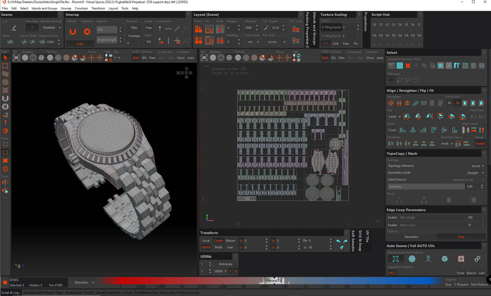 Je nach Modell und späterem Verwendungszweck möchte man es aber nicht vollständig dem Programm überlassen, wo und wie geschnitten wird. Auch hier unterstützt das Programm sehr gut beim Auswählen der Nähte und dem anschließenden Unwrapping und Packen. Man kann sehr leicht und schnell wichtige Bereiche des Modells auf der UV-Kachel größer darstellen und unwichtige kleiner. Die Ausrichtung ändern (generell sollte m. M. nach die Ausrichtung auf der UV-Kachel auch der Ausrichtung des Modell entsprechen, das erleichtert das Texturiren nochmals) ist ebenfalls komfortabel möglich