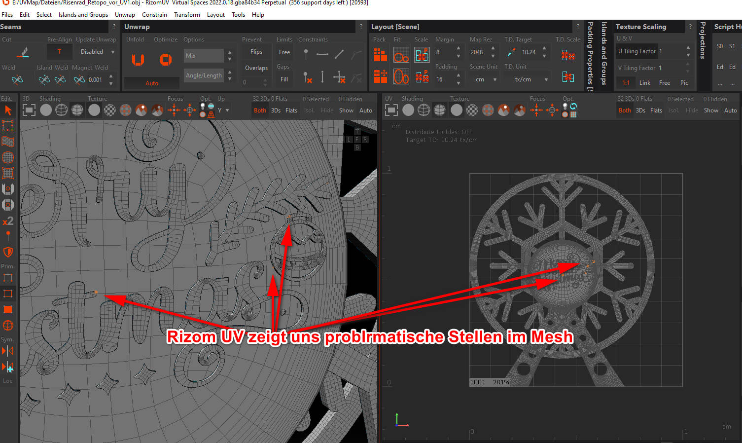 Ist das Modell in RizomUV, kann es auch schon losgehen. Außer, das Programm weist einen vielleicht noch auf Fehler im Modell hin, das macht es u.a. in dem es problematische Stellen nach dem Laden des Modells in Orange anzeigt, sehr hilfreich.
