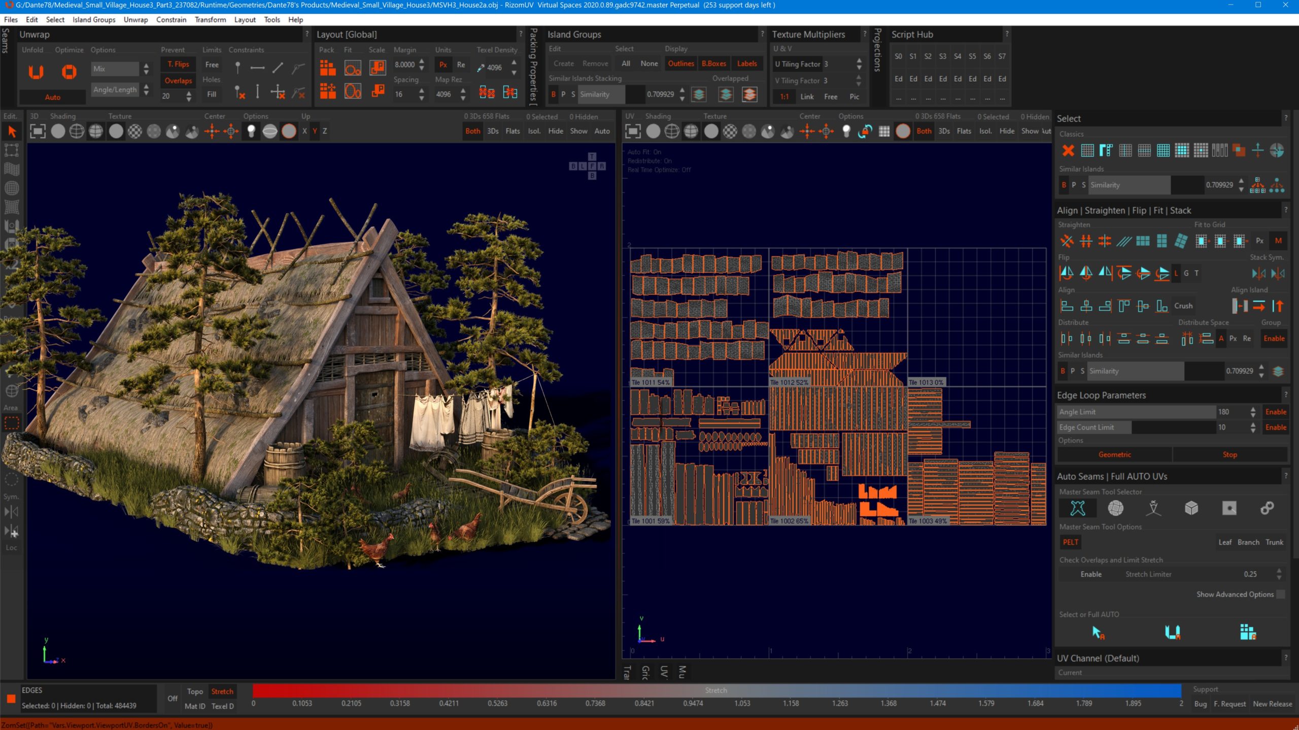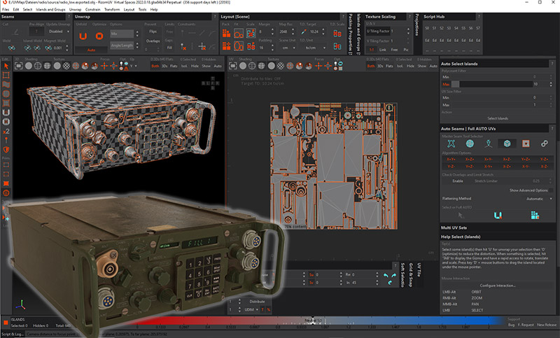Dieser Prozess kann manuell, teil-automatisiert oder vollständig automatisiert ablaufen. RizomUV hat einige sehr clevere Algorithmen mit an Bord, die das automatische Seams-auswählen und Cutting, UV-Unwrapping und Packing in vielen Fällen schon ausreichen lassen. Kleines Beispiel welches zeigt, dass das auch trotz der oben angesprochenen Mesh-Fehler und auch mit Dreiecken funktionieren kann: