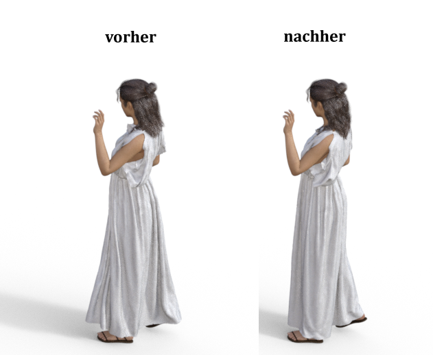 • Habe nach dem Post noch die anderen Render vom Vortag verglichen, dieses "vorher" war auch nicht das Vorher, sondern ein Versuch aus der Mitte und die letzte Version sah vom Stoff eigentlich wieder wie die erste Version aus. Wenigstens habe ich mir die Pose als Preset gespeichert und es geht nun schnell bei 0 noch einmal sauber anzufangen.