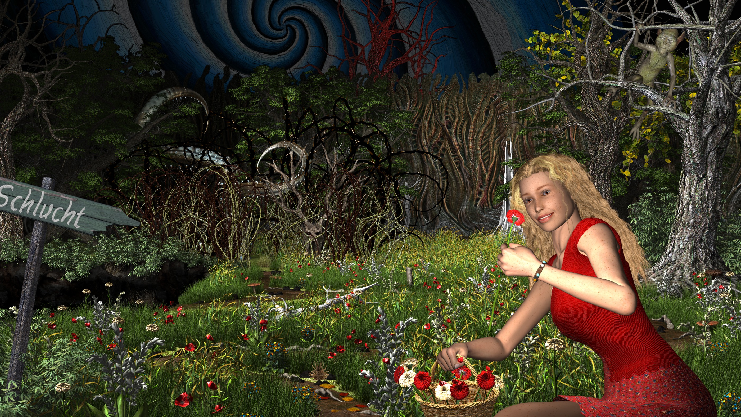 Der Wald ist tatsächlich schon sehr gruselig und der Himmel ist zwar nicht ganz mein Fall, aber er macht es noch unangenehmer. Das Mädchen scheint noch nichts zu ahnen und lässt sich von den Blumen locken.