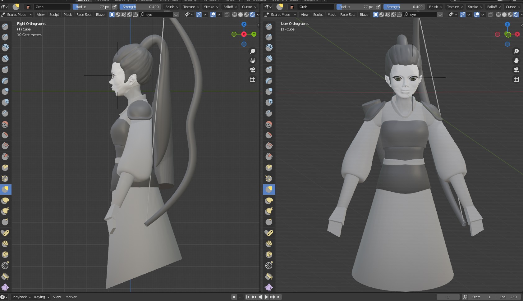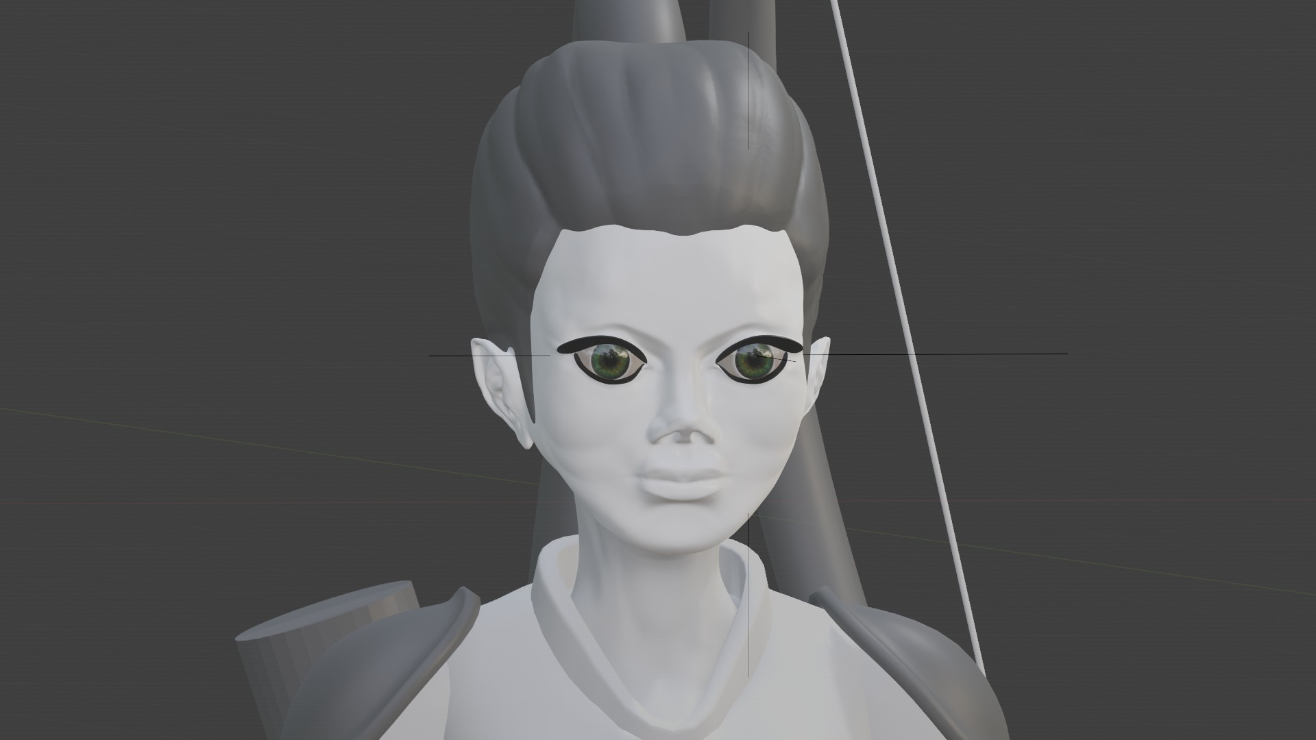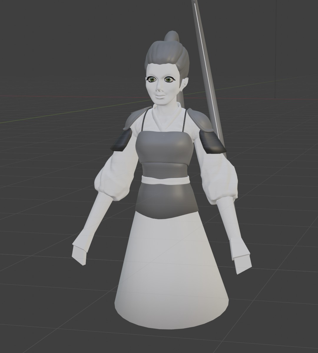Ich habe mit Absicht ein anders Gesicht gemacht, weil ich nicht so mit den weichen Typen kann. Ist nicht mein Ding. Die Gute bekommt auch in dem Video-Lehrgang keine Beine. Die werde ich aber noch dazu machen. Außerdem nimmt sie eine etwas unvorteilhafte Arm-Stellung ein, um sie später zu Riggen. Das werde ich auch anders anlegen und dann noch ein Rig einbauen.