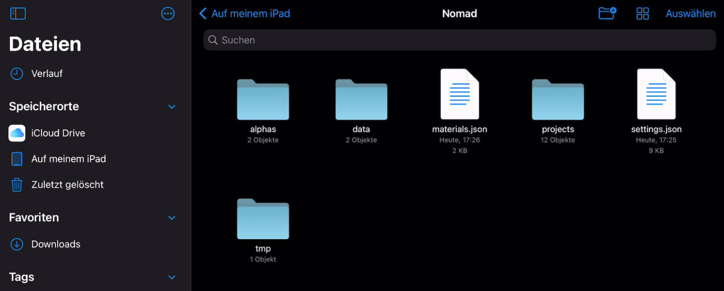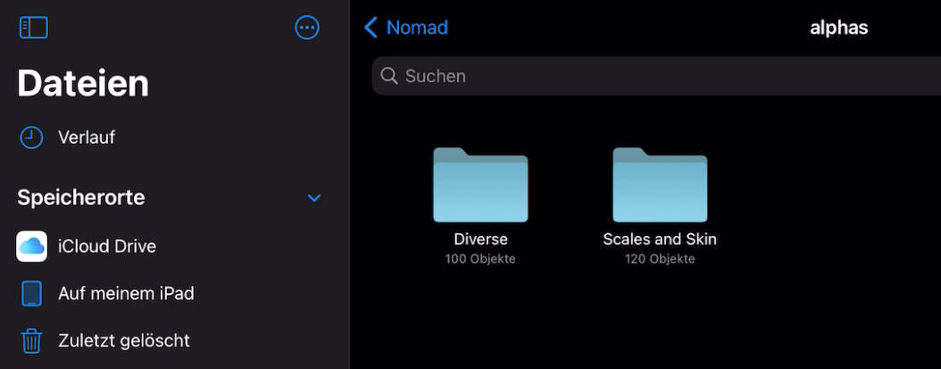 Man erstellt die Unterordner, in die man die Alphas einsortiert einfach unter auf meinem iPad >> Nomad >> alphas. Als z.B. auf meinem iPad >> Nomad >> alphas >> Scales and Skin.