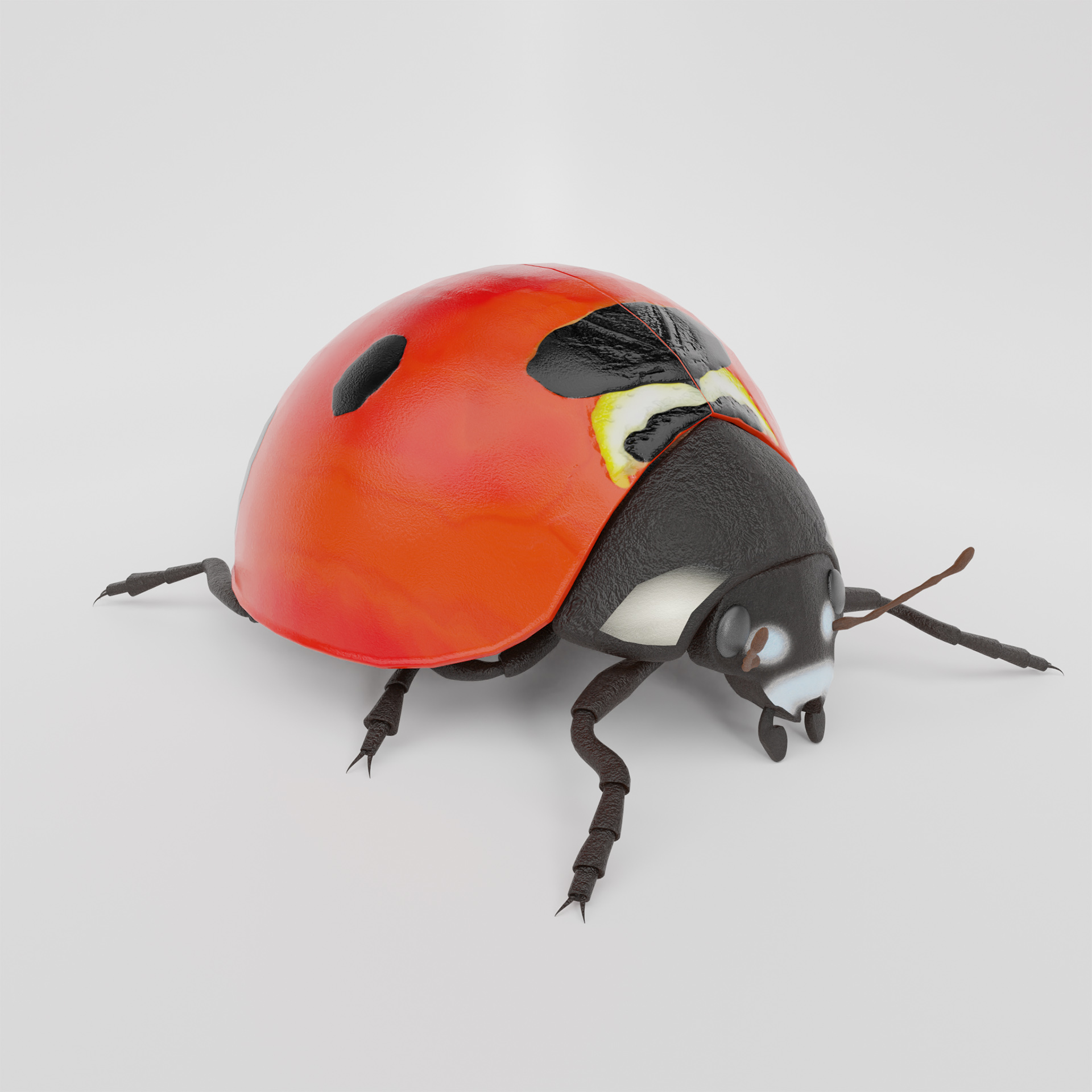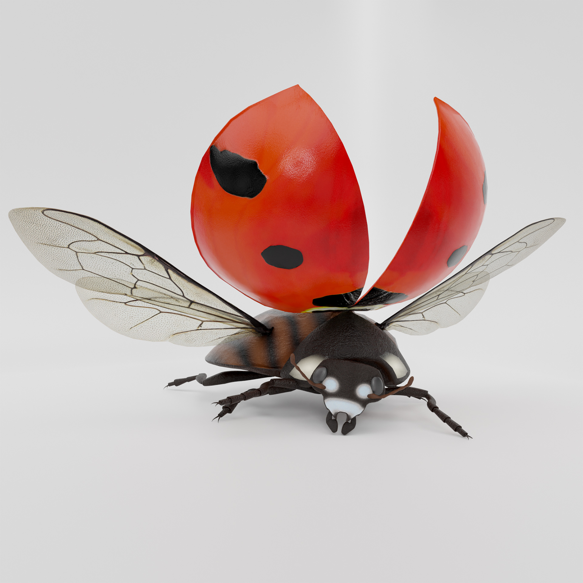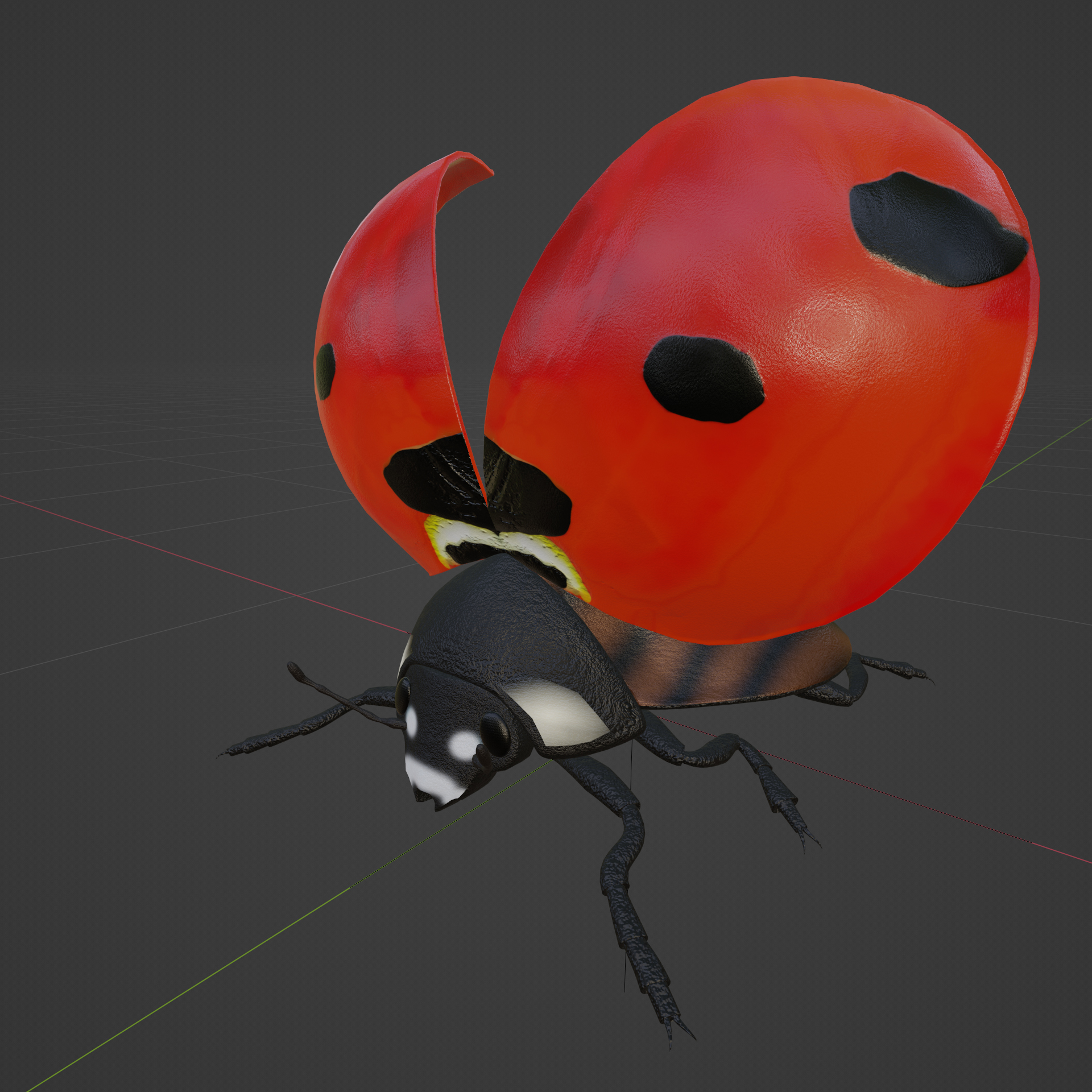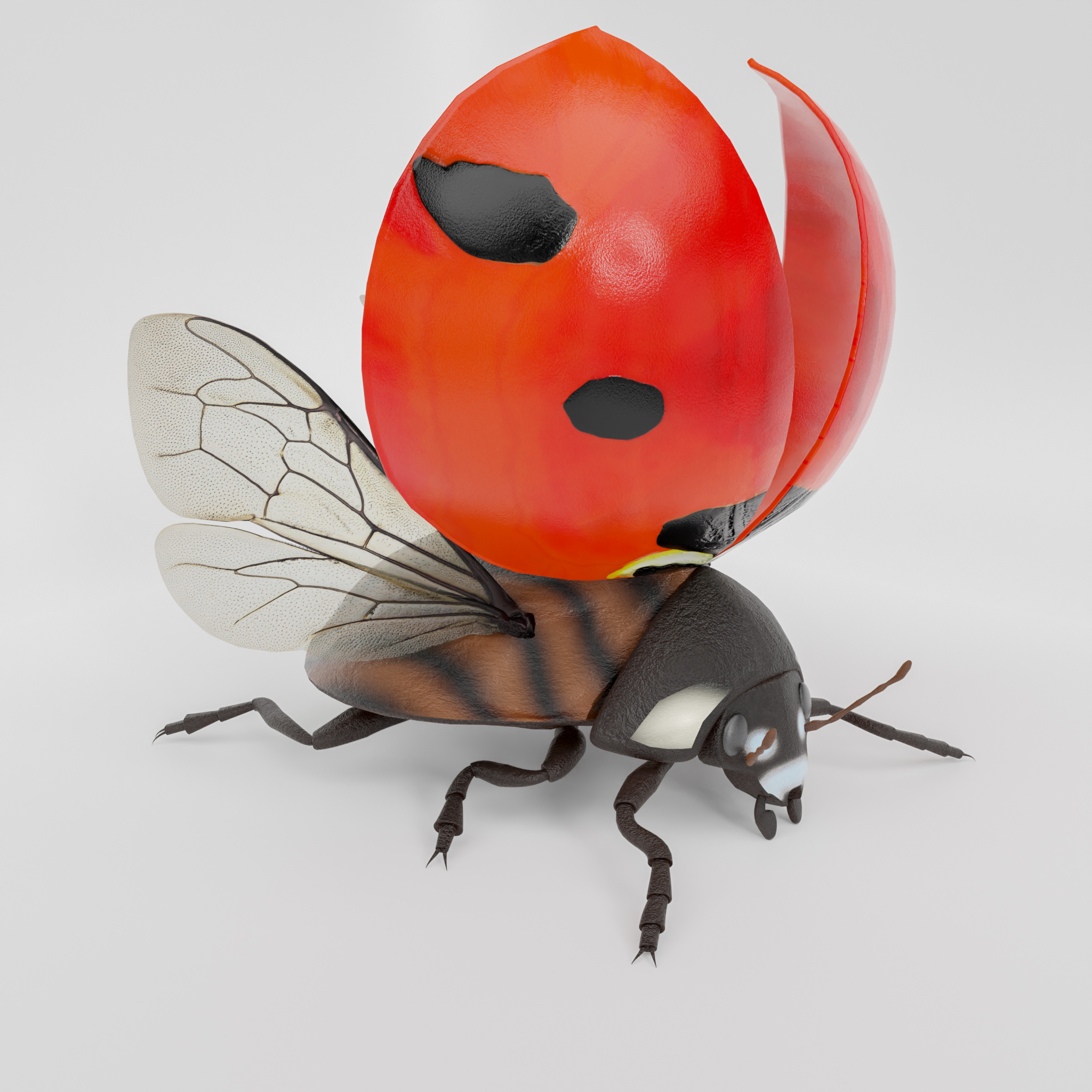 dieser ladybug ist voll geriggt, du kannst die Klappen öffnen und die Flügel entfalten, der kragen und der Kopf sind auch voll beweglich. einige Posen sind schon in der Posen bibliotheke vorbereitet. ideal um den Käfer zu untersuchen oder animationen zu machen.