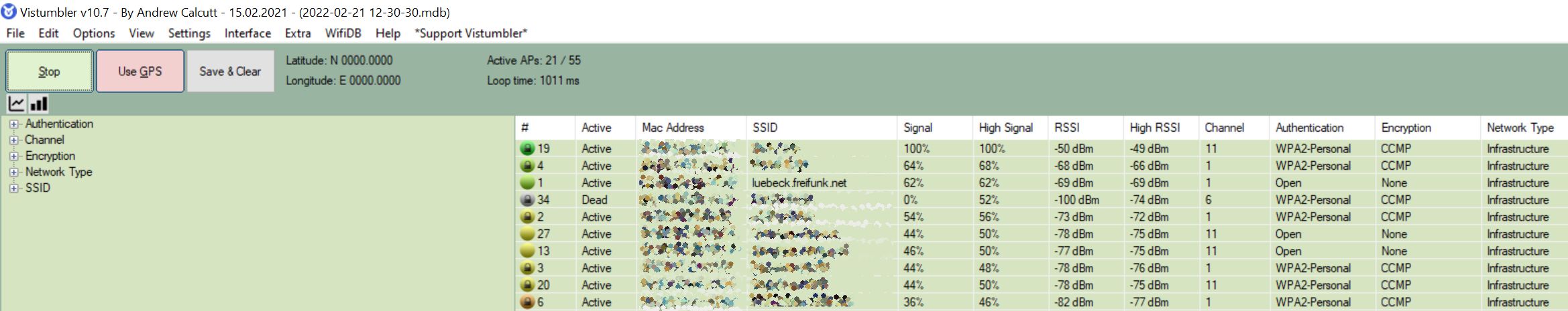 Erster Test: Viststumbler meldet unzählige Wlan-Stationen - cool, aber keine davon gehört zum Freifunk- oder SH-Netzverbund. In Richtung des nächsten Zentralknotens versperrt Beton die Sicht. (Wären chinesische Richtantennen und Booster hierzulande legal, wäre es kein Problem, durch den Beton zu brutzen und darin befindliche Mikrowellen zum Leuchten zu bringen *scherzel*, aber wir befinden uns hier in einem reglementierten Rechtsstaat - also ein No-Go für solche irren Aktionen.