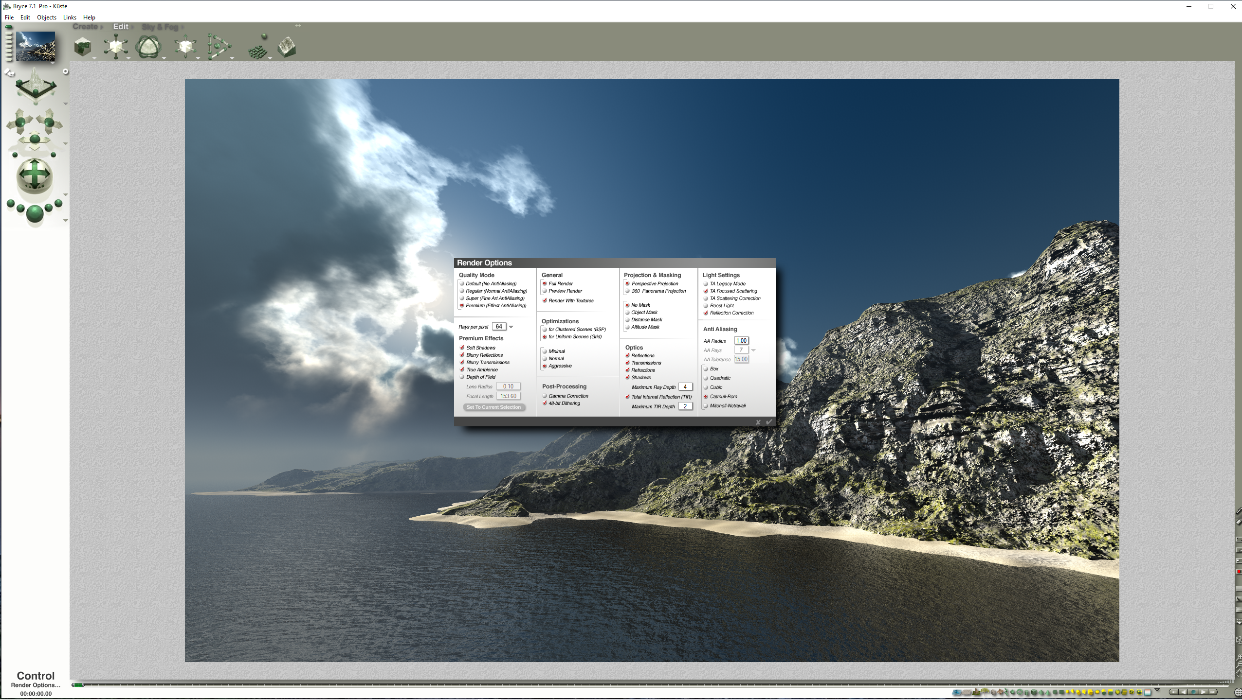 Jetzt kann ich mit dem neuen Rechner endlich die maximalen Rendereinstellungen von Bryce benutzen. Die Ergebnisse sind wirklich spektakulär. Aber Bryce ist halt nur eine 32bit App, was sich in den Renderzeiten auswirkt. Trotzdem lassen sich beachtliche Sachen machen, insofern man nicht Animationen berechnen will. Denn bei Animationensberechnungen sind die Wartezeiten gewaltig hoch. Was sich im vernünftigen Rahmen nur mit einer Renderfarm berechnen lässt.