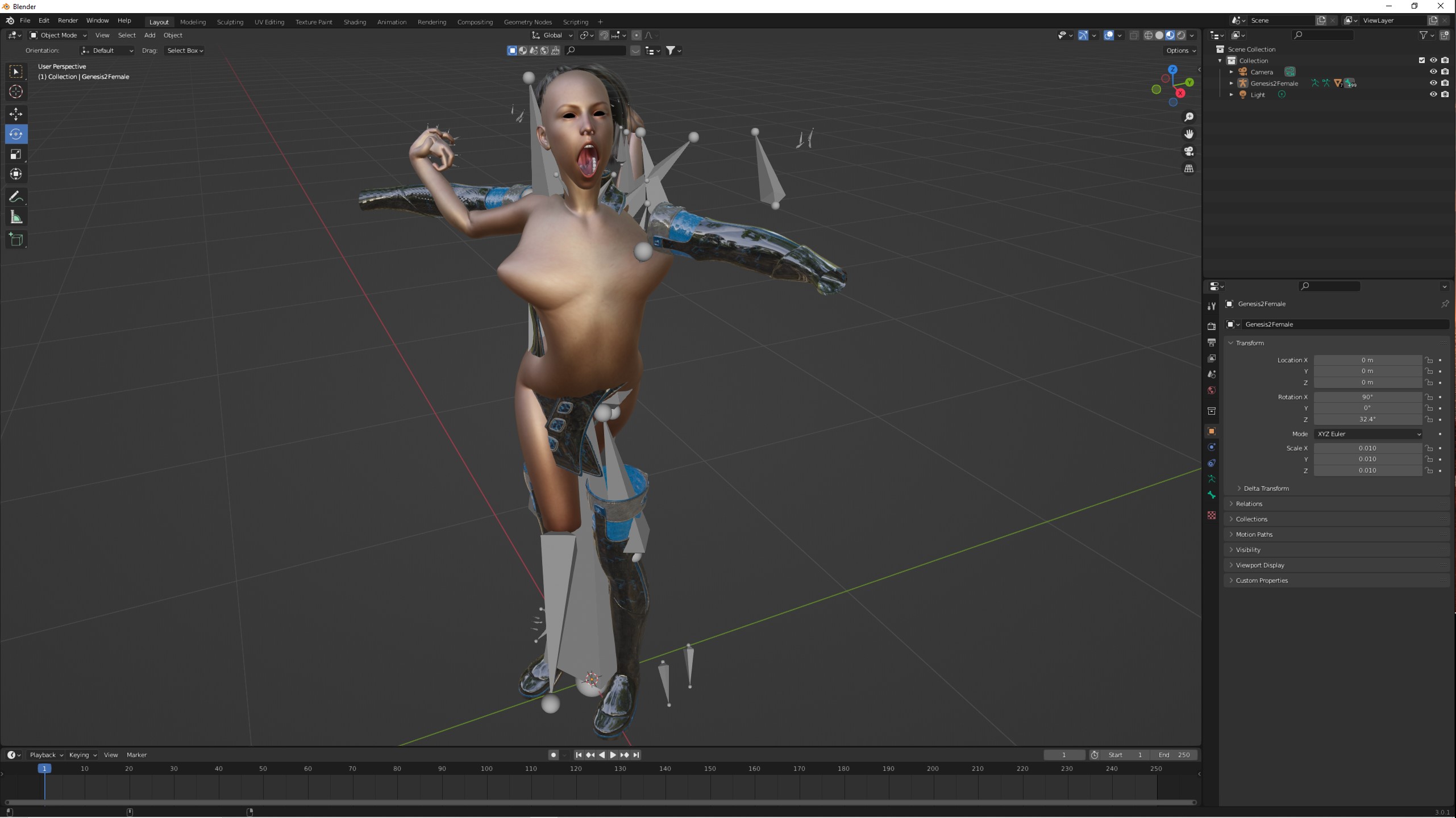 • Die Sache mit den Augen und Augenbrauen ist lösbar. Dazu gibt es einige Tutorials auf YT. Was die verkrüppelten Posen betrifft, so war das ein Problem, welches ich mit Poser->DAZ->Blender bei meinem Lieblingsfrosch nicht lösen konnte. Es funktionierte mal, aber nun nicht mehr, oder es ist einfach zu kompliziert geworden.