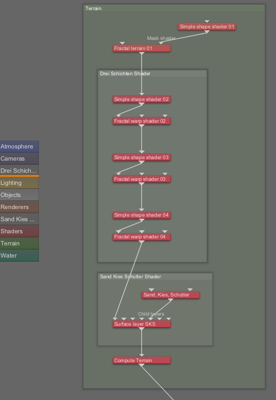 • Für den Anfang ein einfaches Beispiel. In den letzten Wochen sollte für eine Szene ein Terrain etwas abgetreppt oder terrassenförmig gestaltet werden. Doch wie dabei vorgehen, war die Frage. Einen "Strata and Outcrops Shader" gibt es, auch ein Beispiel, wie sich damit Reisterrassen ähnlich den philippinischen Reisfeldern erstellen lassen, wurde gefunden. Für kleinere Höhen und mit kleineren, dafür gut steuerbaren Abständen, wurde eine eigene Lösung getestet und verwertet. Die verwendeten Shader sind erkennbar, die Einstellungen simpel.