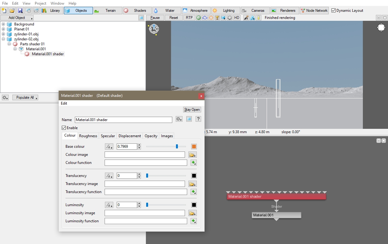 Doch im Allgemeinen, Terragen ist in erster Linie ein Landschaftsgenerator, die verfügbaren Objekte eher Primitive, importierte Objekte lassen sich aber eigentlich gut für Szenen anpassen. Nur wenn Texturen noch nicht richtig zugewiesen wurden, dann sind beide Vorschauen von TG nicht optimal dafür ausgelegt, komplexere Texturierungen erst in TG nachholen zu wollen. Dafür sind 3D Anwendungen, wie Blender, besser geeignet, für die Neuanfertigung von Objekten ohnehin.