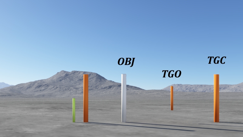 Etwas anderes sieht es mit einer Umspeicherung von OBJ nach TGO aus, diese können vermutlich von Terragen etwas schneller und leichter gelesen werden. Dabei sollte dieses Objekt aber für die Speicherung 1,1,1 skaliert bleiben. Andernfalls bietet sich eine Speicherung als TGC Clip File an, die dann ebenfalls in jedes TG Projekt importiert werden kann, in dem diese benötigt wird.