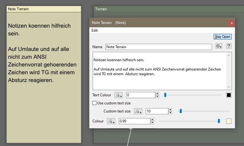 Bei der Weitergabe eines Projektes kann es von Vorteil sein, Anmerkungen und kurze Notizen im Bereich des unteren Node Network Fensters zu platzieren. Dazu genügt eigentlich ein Rechtsklick in einem freien Bereich dieser Ansicht und im sich öffnenden Kontextmenü Create Other -> Note wählen. Die Angelegenheit hat nur einen winzigen Haken, der kleine Editor scheint nur ANSI zu verstehen.