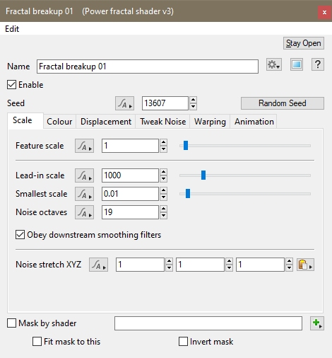 Wem die Verteilung noch nicht wirklich gefällt, braucht nicht gleich den Fractal Breakup Shader verlassen, sondern kann in diesem noch eine andere Seed per Random auswürfeln oder diese manuell eingeben, um sich zwei bis drei Seeds zu notieren, die ein besseres Ergebnis lieferten. Wenn auch dieses nichts bringen sollte, kann man sich erneut dem Surface Layer Shader zuwenden, um hier noch einmal mit dem Wert für Fractal breakup zu spielen.