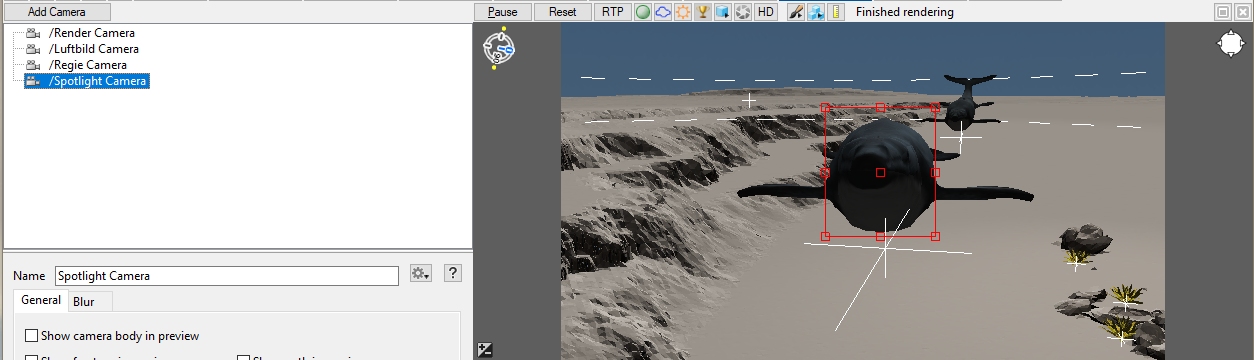 Regie-Kamera sucht für Render-Kamera neue Perspektive, doch die Plane lässt sich zwar verschieben, nicht aber ins Bild drehen.