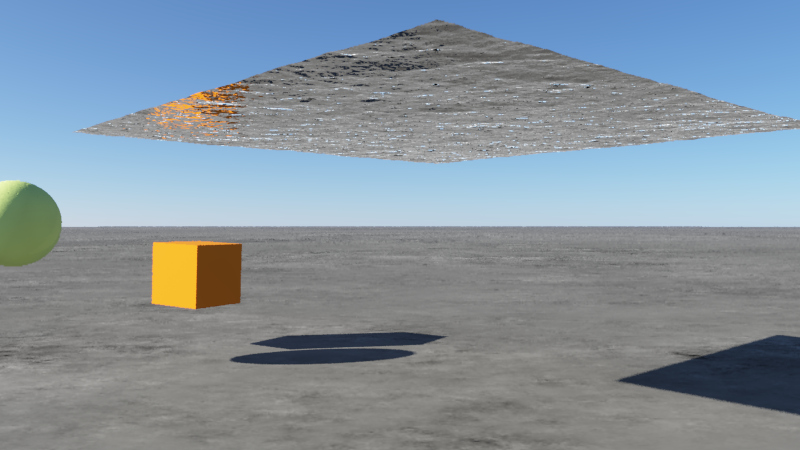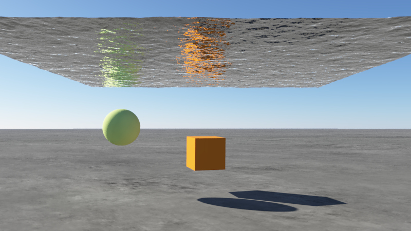Auf eine, in der Szene weiter oben sichtbare, Wellenschicht wurde bei dieser Wassertiefe verzichtet, doch auch so gab es damit Probleme. Mit einer Kamera bewegt sich ein Motiv-Suchender in der Szene, dreht sich dabei und bleibt nicht im rechten Winkel zu einer Koordinatenachse. Bei einer Plane allgemein, und hier im Speziellen für die Wellenschicht, fehlen aber die Einstellmöglichkeiten für eine XYZ Rotation.