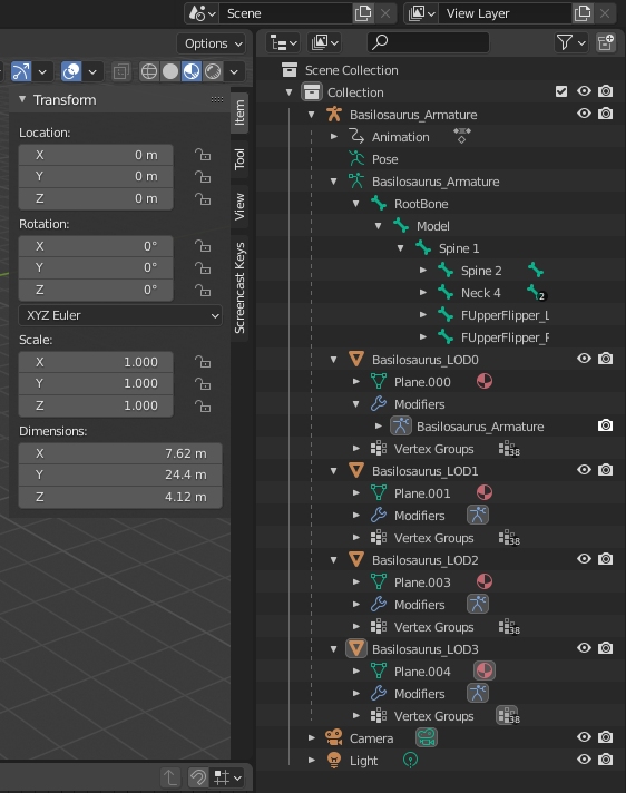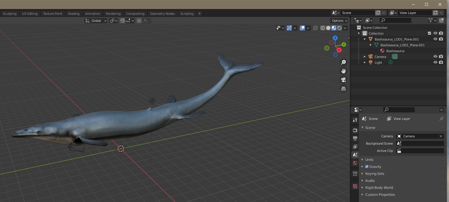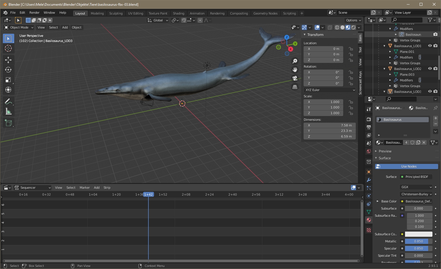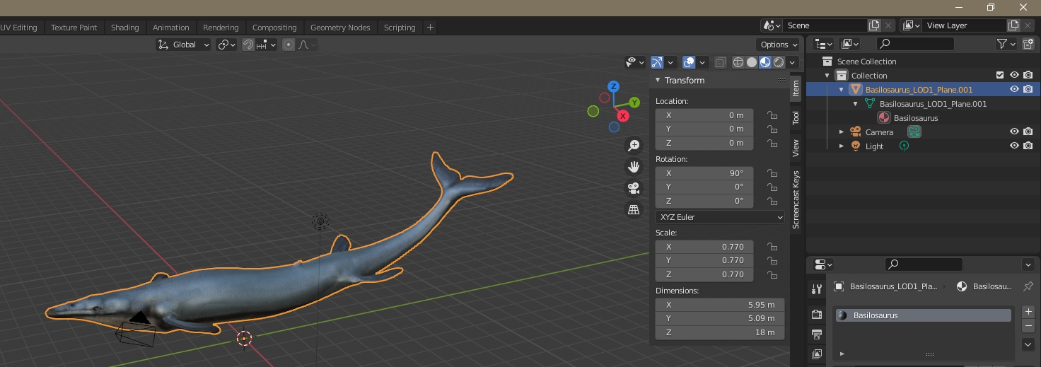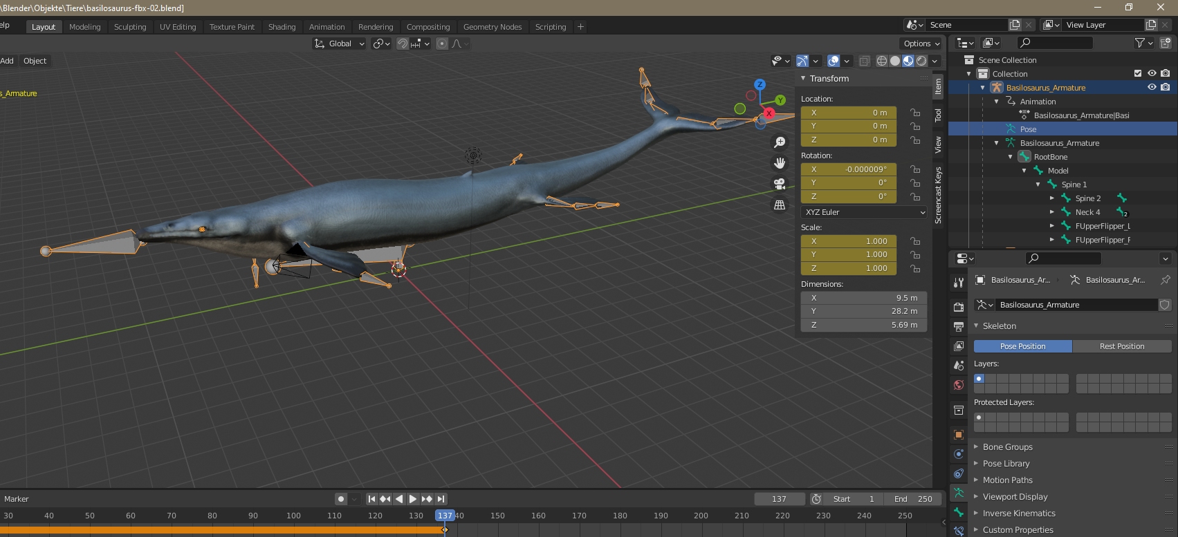 Kleine Animation eines nahen Verwandten heutiger Wale, aus der ich aber nur zwei Posen als Objekt benötige. Denke das klappt, wenn ich im Sequenzer stehenbleibe. Was gar nicht klappen möchte, ohne das sich alles verschiebt, ist die Skalierung der Größe. Wenn die Schwanzflosse unten ist, wird der mit über 26 Meter angezeigt, die wurden aber nur 18 Meter groß.