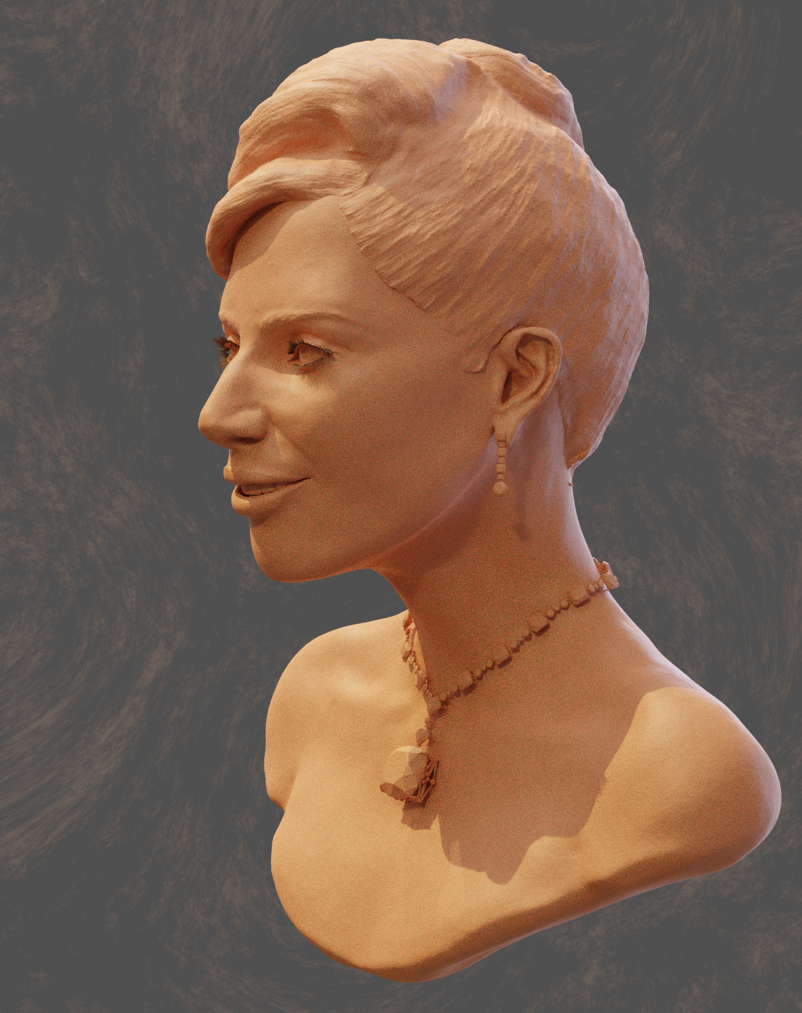 From scratch aus einem runden digitalen Klumpen Lehm entstanden, der Schmuck ist natürlich modelliert (Diamanten findet man in Blender wenn man Mesh - Extra Objects aktiviert) und die Wimpern sind Hair-Particel.