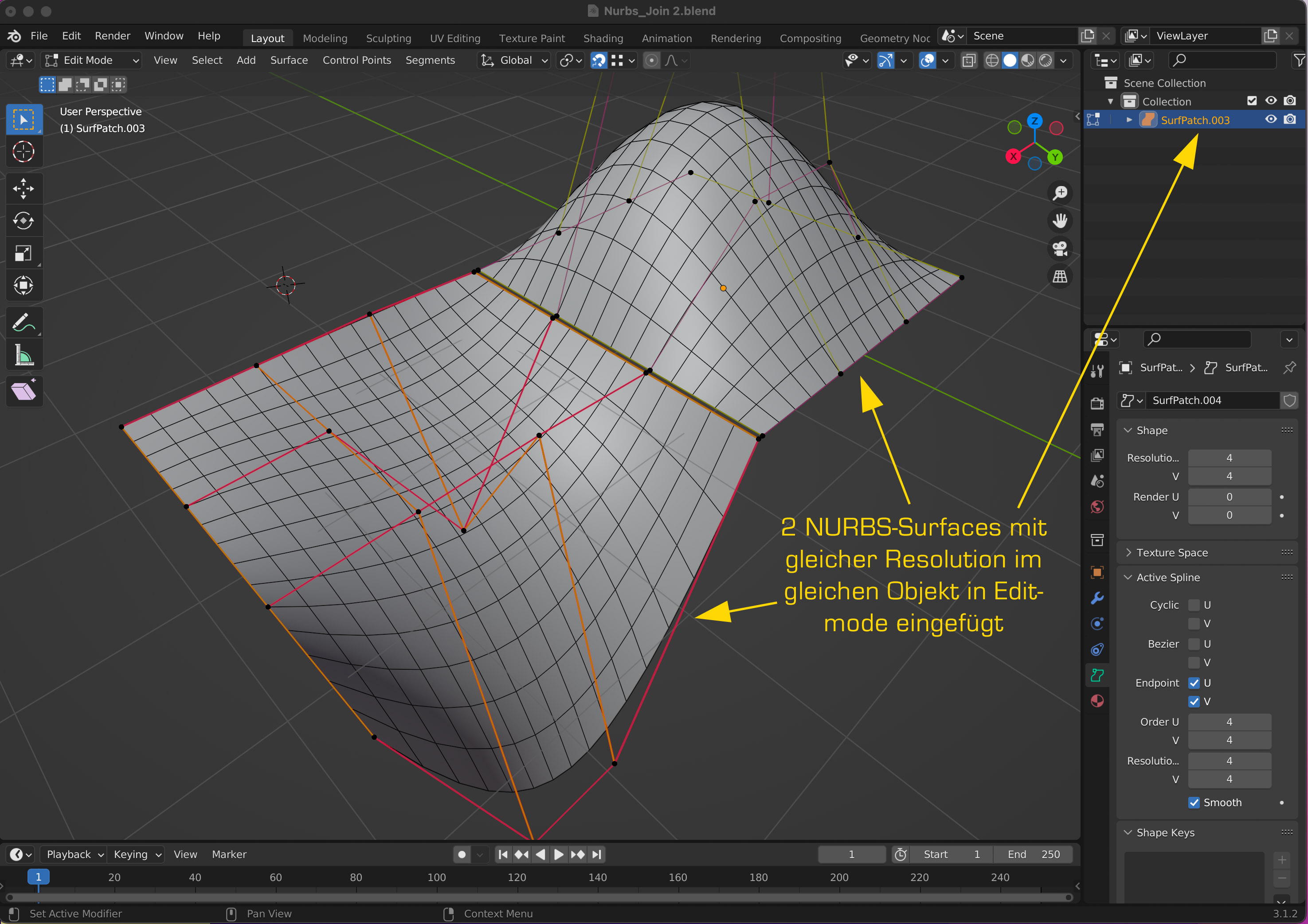 > Hab 2 NURBS Surfaces im gleichen Objekt in Edit-Mode eingeführt (müssen gleiche Resolution haben)