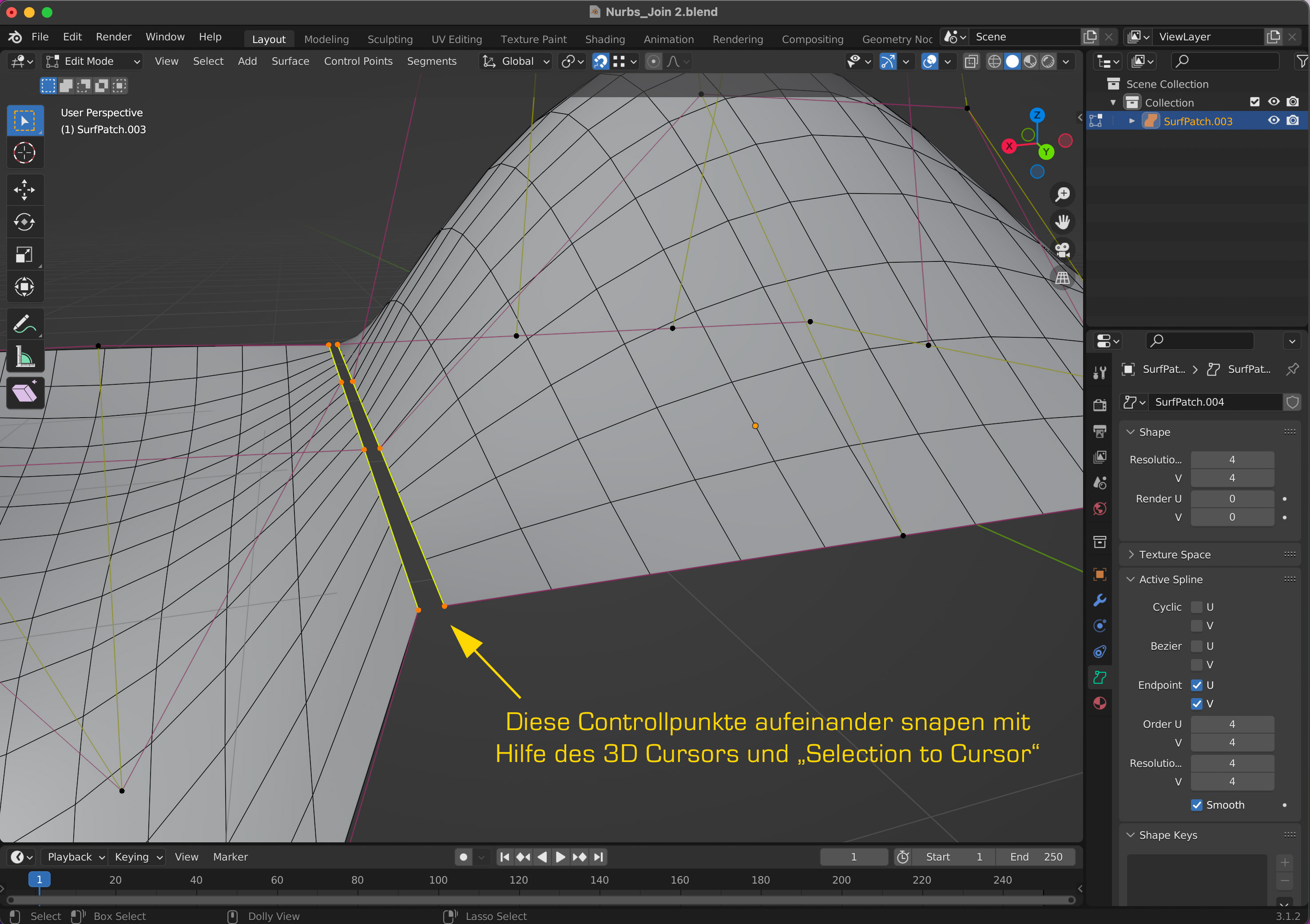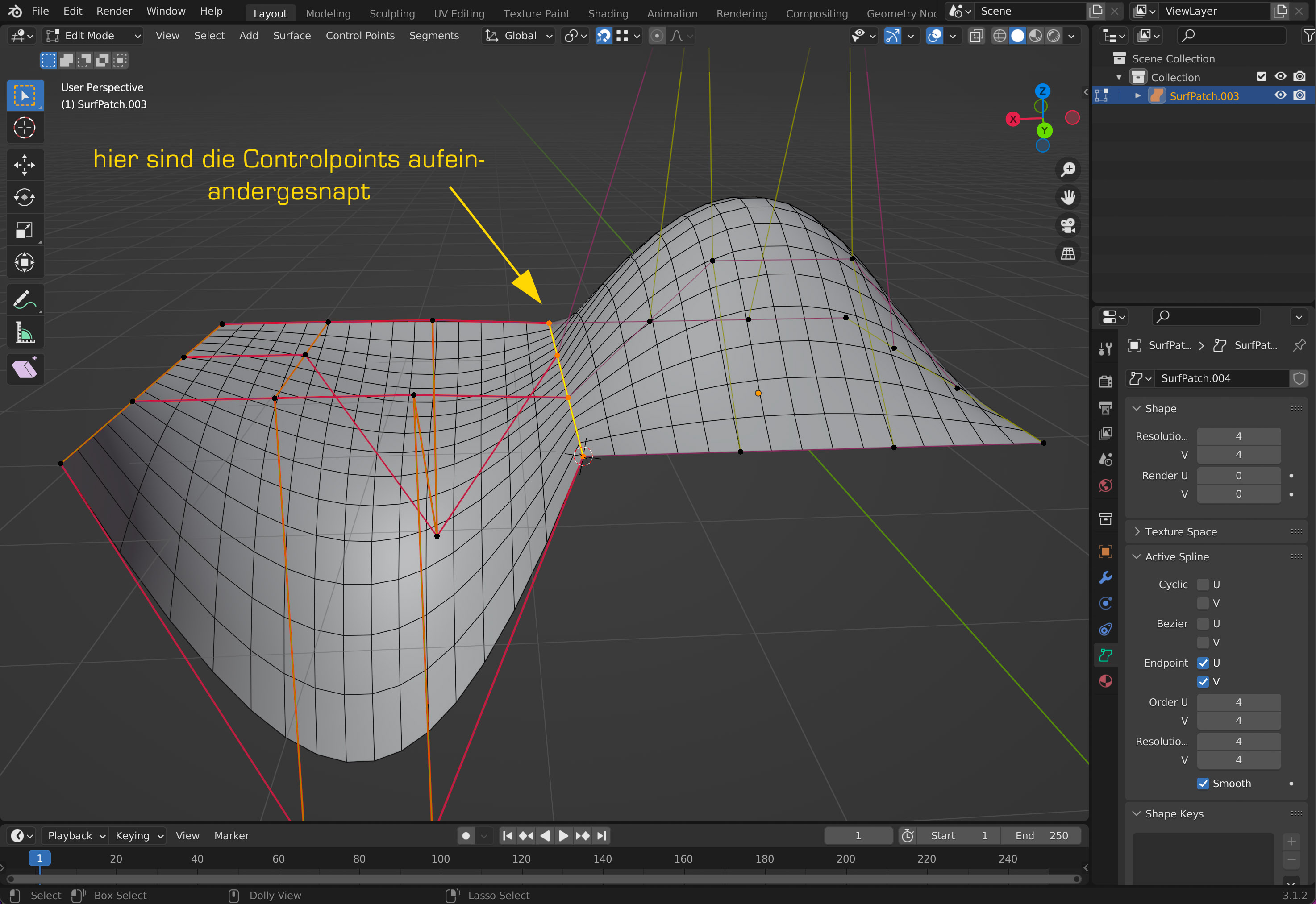 Nun mit Hilfe des 3D Cursors habe ich alle berührenden Kontrollpunkte aufeinandergesnappt.