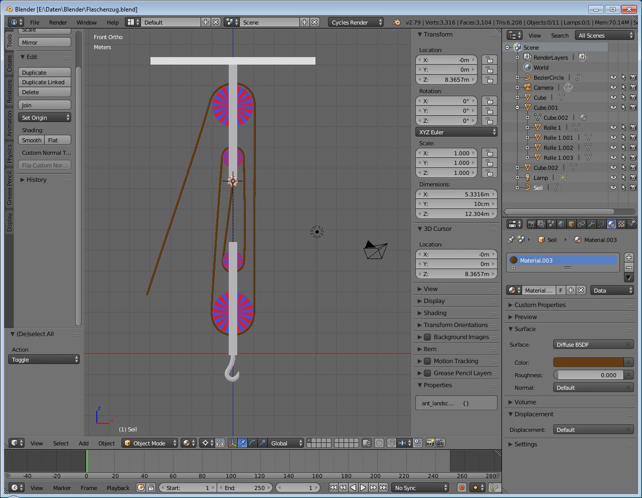 Kleine Info am Rande, aber wichtig: Die Rollen sind jeweils eigene Objekte, die Halterungen auch und bei dem Seil handelt es sich um eine Bezierkurve. Wenn man also an dem Seil zieht, sollte sich der Haken nach oben bewegen. (Und anstelle der frei schwebenden Platte hier setzen wir natürlich eine Zimmerdecke oder einen Kranausleger oder was passendes anderes.