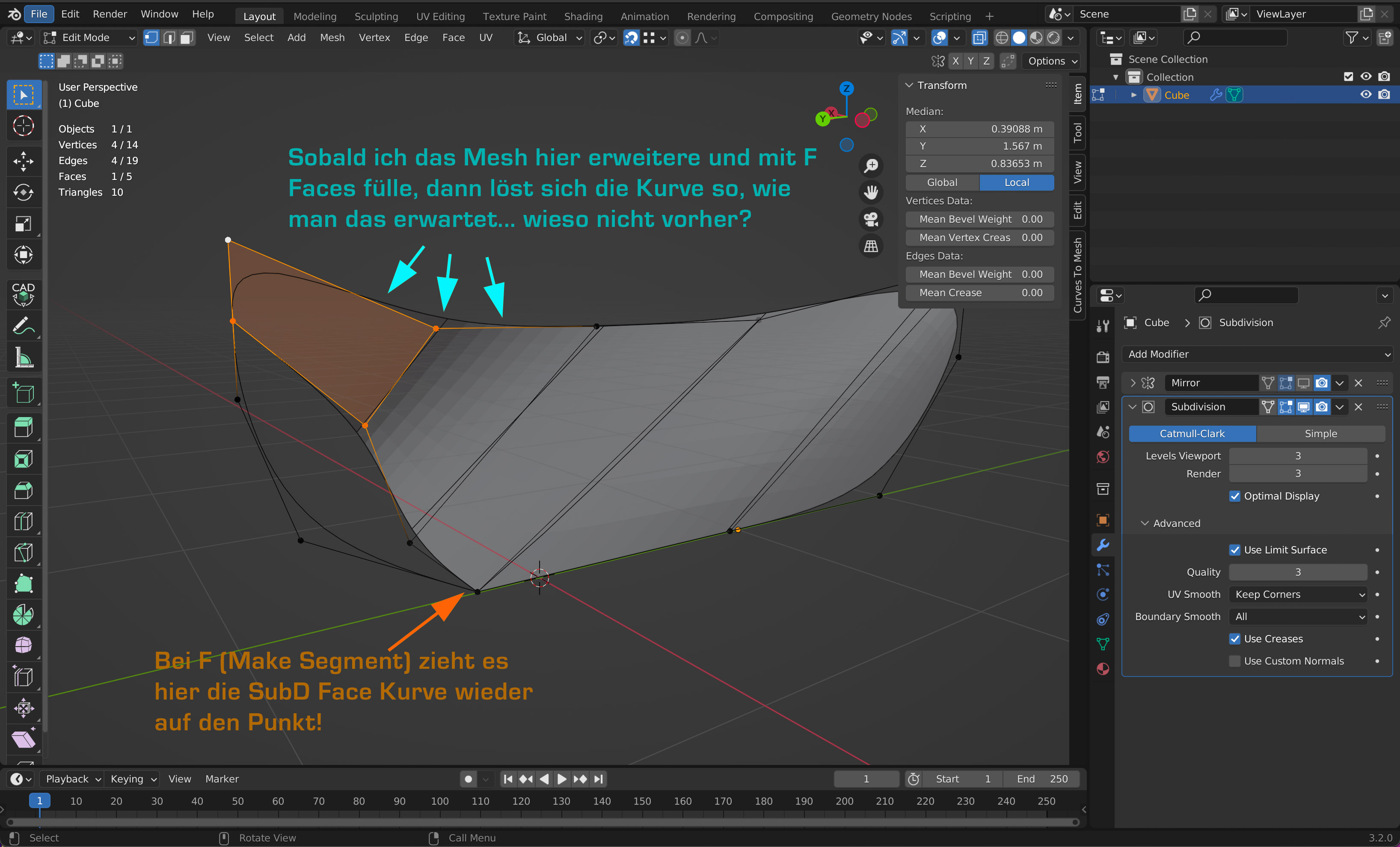 • Bei den Verbindungsstellen welche mit "F" erstellt werden kollabiert der SubD-Verzug... und lustigerweise kommt dieser aber später wieder zurück wenn man das Mesh so erweitert und Faces einfüllt wie im letzten Screenshot sichtbar.