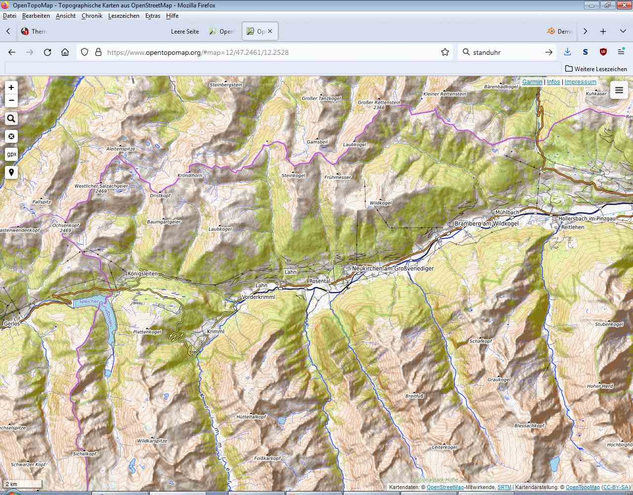 In diesem Beispiel hab ich das alles von Hand gemacht. Aber wenn man nicht nur einen Berg hat, sondern einen ganzen Gebirgszug, bestehend aus einem zentralen Tal mit allen Bergen links und rechts davon, kann das u.U. sehr langwierig und meditativ werden kann. Vor allem dann, wenn der Gebirgszug so ähnlich aussieht, wie dieser Scrennshot aus OpenTopoMap: