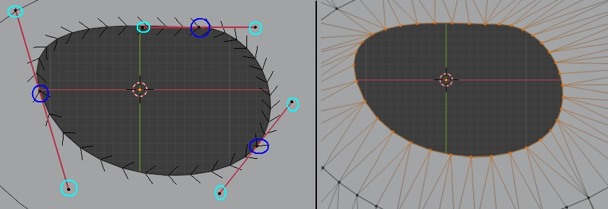 Diese Form hab ich in Blender einmal als Bezierkurve (links) und einmal als Mesh (rechts) vorliegen, wobei das Mesh aus der Kurve entstanden ist, d.h. die Kurve in ein Mesh konvertiert wurde.
