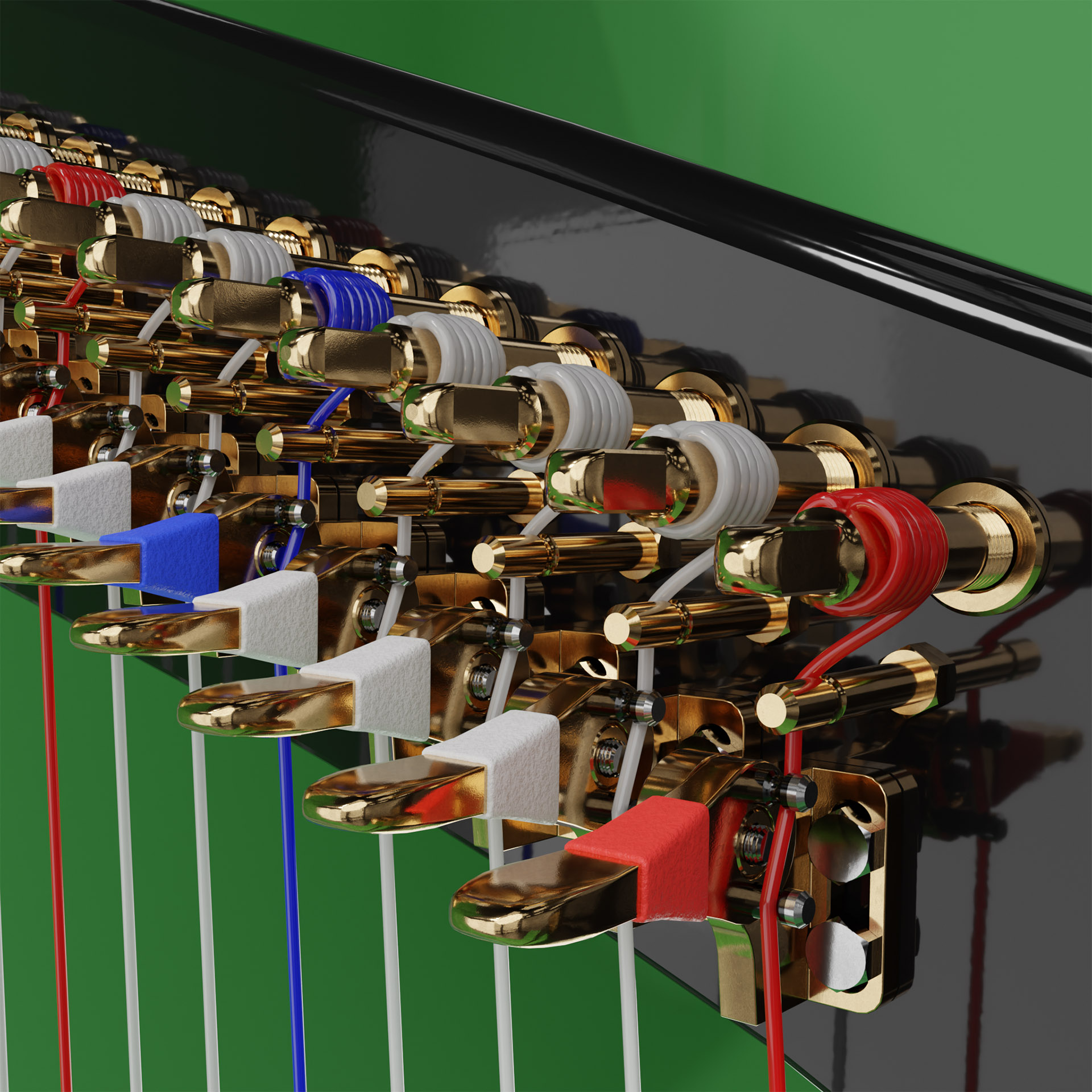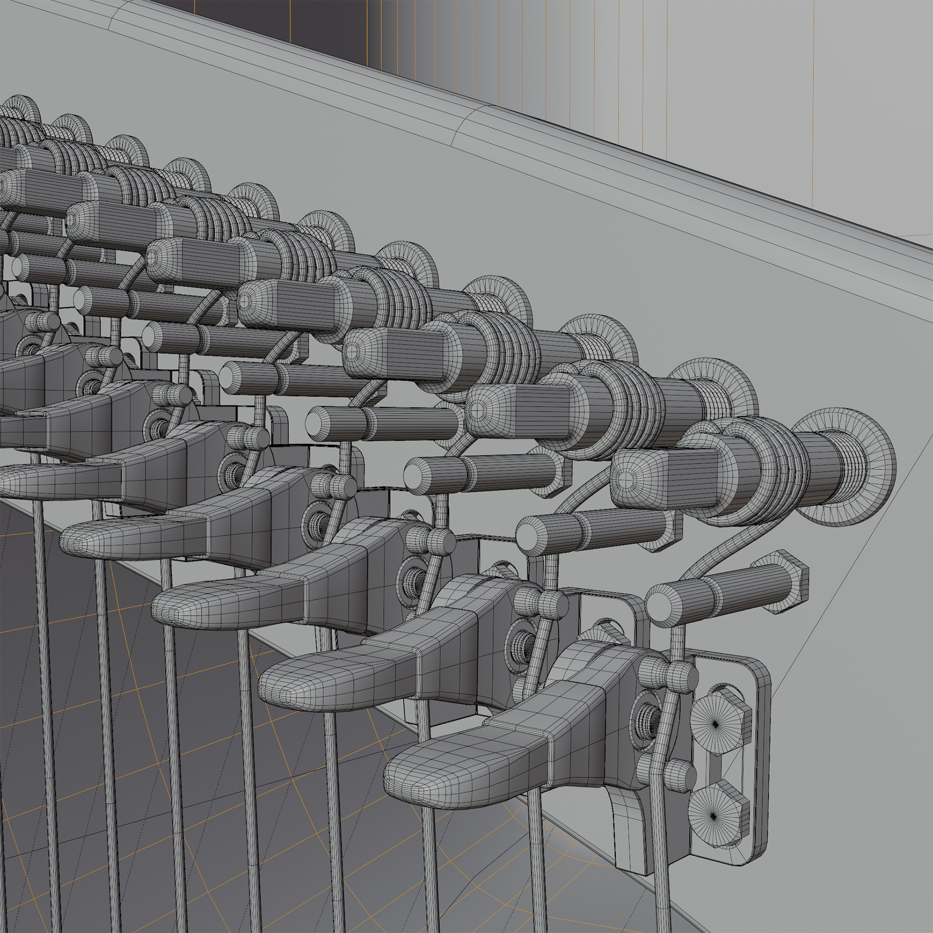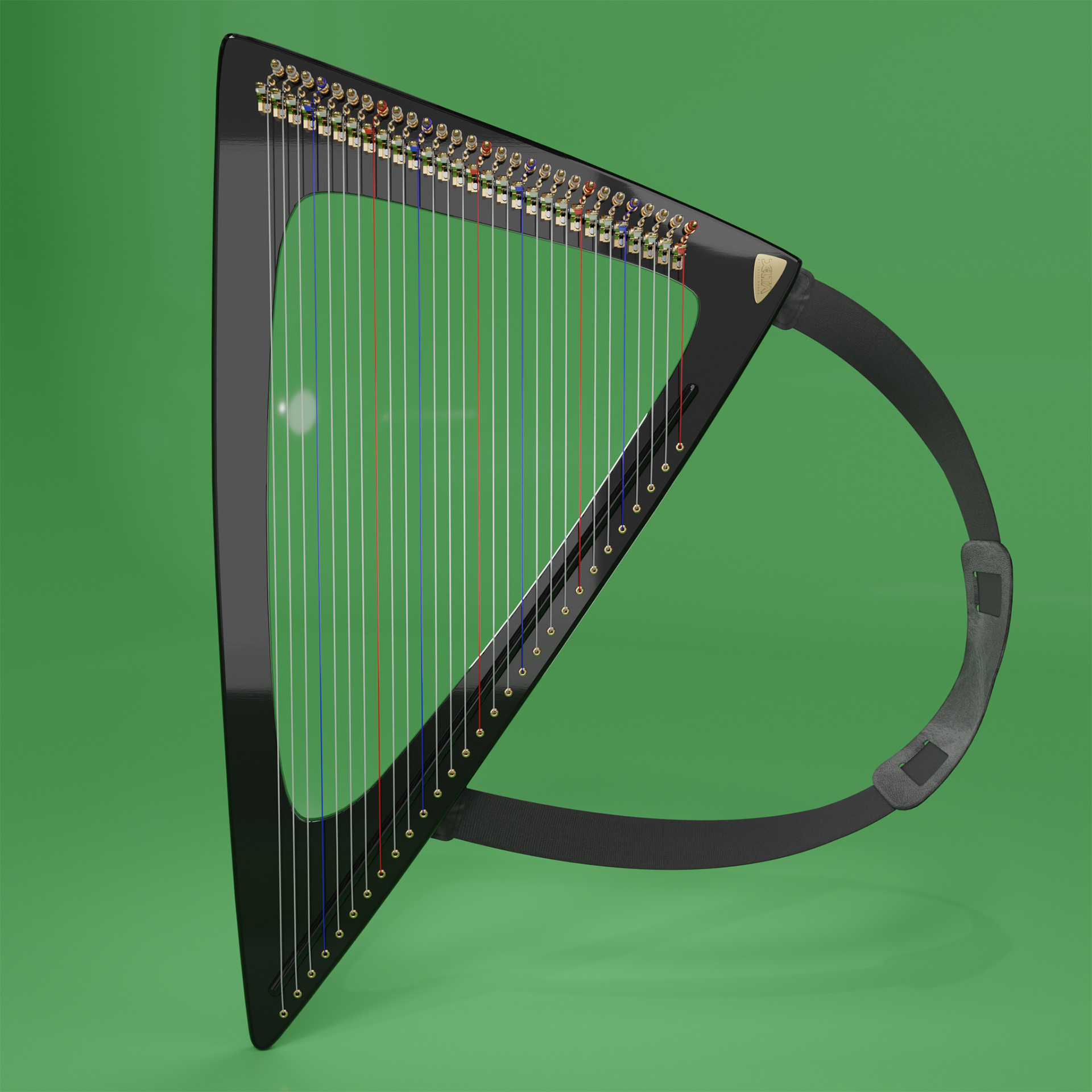 Eine tragbare elektrische Harfe aus dem hause SALVI. die Harfe ist mit halbton klappen ausgestattet und hat einen tragegurt. die oberen saiten befestigungen und die Halbton klappen sind instanziiert, deswegen siehst du im vewport eine Halbton klappe mehr. diese wird aber nicht mit gerendert. wenn du die Halbtonklappen bearbeiten möchtest musst du diese zusätzliche halbtonklappe bearbeiten.