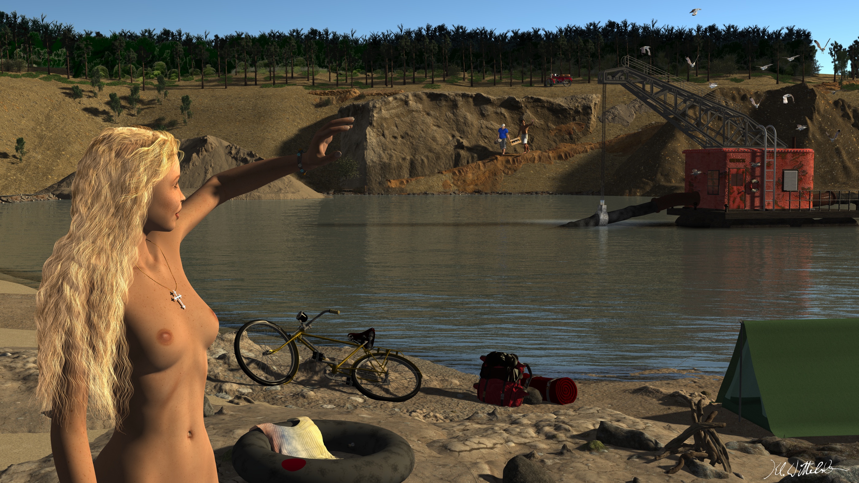 Pflanzen, Fahrrad und Rucksack sind gekauft, für den Hintergrund habe ich Waldrand-Fotos verwendet. Landschaft ist mit CARRARA-Generator erstellt.