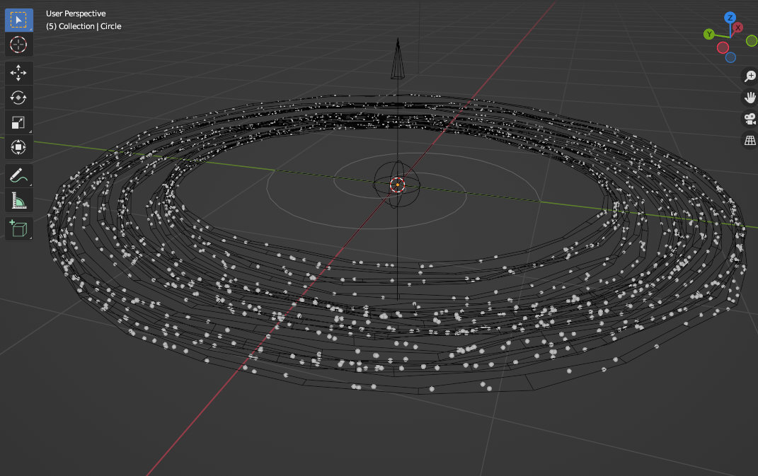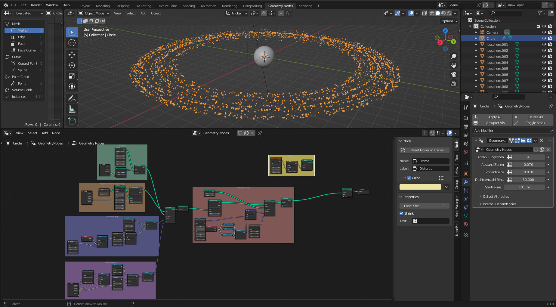 Hab's mal kurz getestet, aber leider funktionieren die Partikel hinter den GeoNodes nicht. Wenn ich den GN-Modifier anwende, habe ich zwar die verteilten Ringe und wenn ich einmal in den Edit-Mode und zurück gehe, tauchen auch die Partikel wieder auf, aber die Wirkung ist mäßig. Aber vielleicht bringt Dich das auf Ideen.