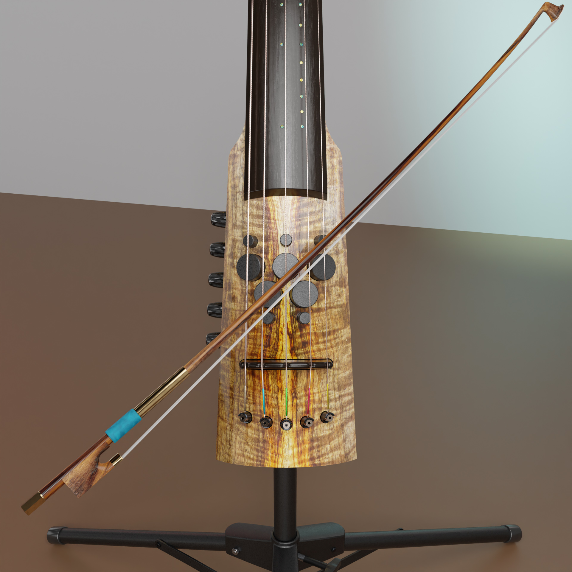 zuerst mochte ich den Bass nicht all zu sehr aber im Laufe meiner recherchen und dem modellieren habe ich den Omnibass richtig lieb gewonnen ein echter univerasl Bass! kein wunder das er ein Design preiss eingeheimst hat. achja ich hab die Mensur makrierungen die hier aus opalen besteht noch ein bischen schiker gemacht und die Saiten textur verbessert so das jetzt auch gute nahaufnahmen möglich sind z.B. bilder von riffs oder zupftechnichen am Kontrabass. :saint: