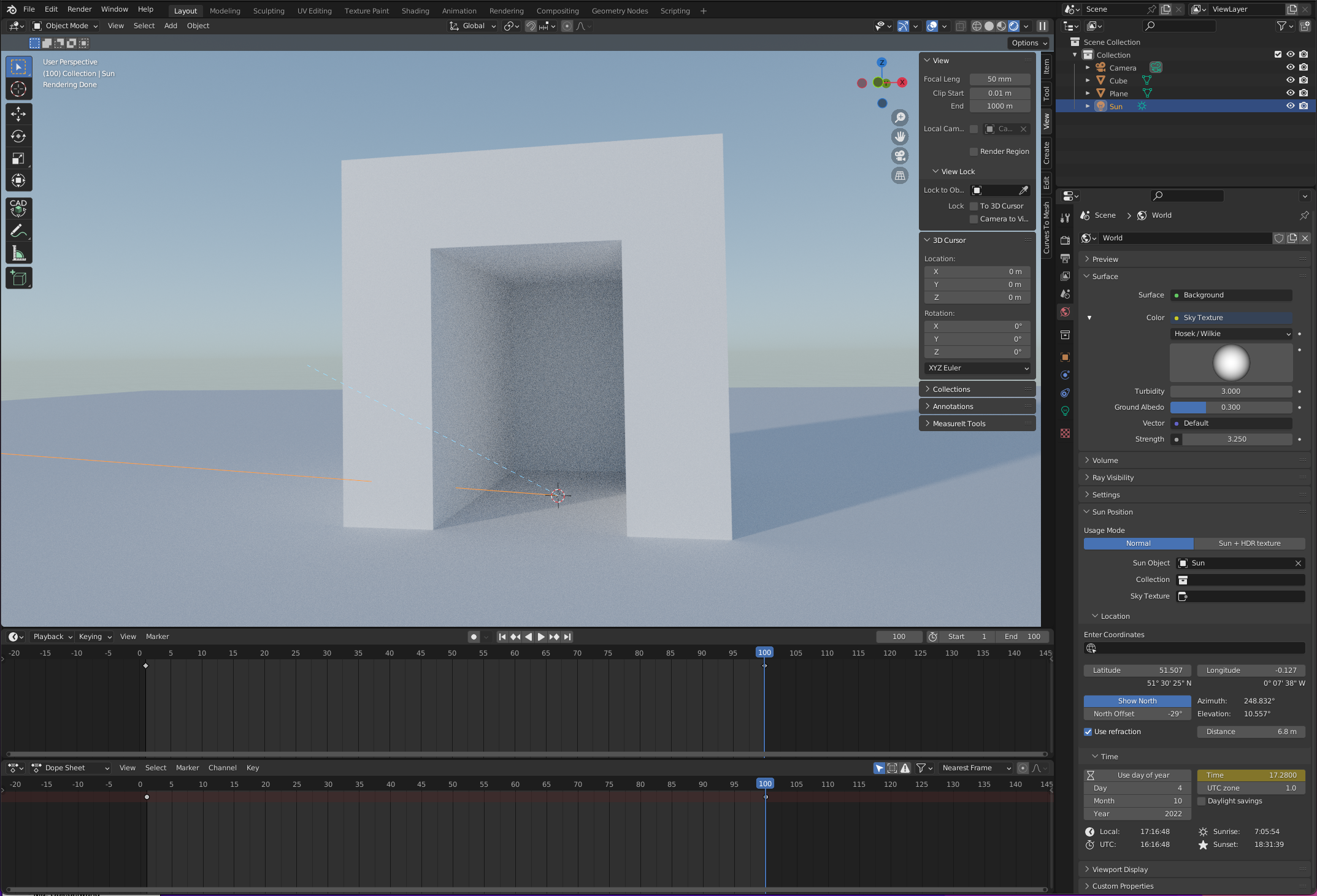 Habe 100 Frames gewählt und die Tageszeit in den Addon Properties bei Frame 1 und bei Frame 100 mit einem Keyframe versehen.