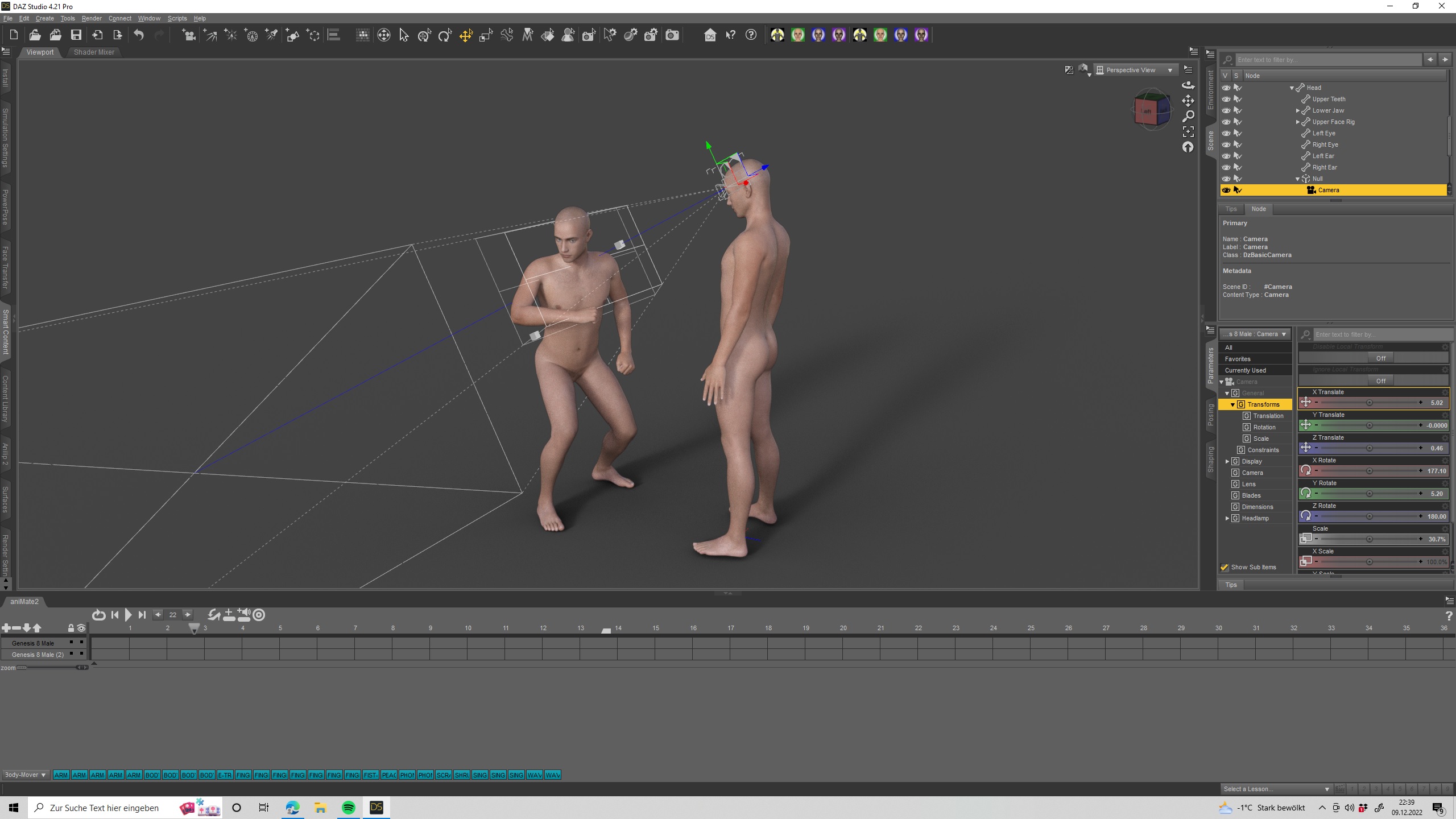 Wunderbar, dass funktioniert soweit ganz gut. Einziger Nachteil ist das Video ist nun doppelt so groß (nicht wirklich schlimm) aber die Render Zeit hat sich durch die zweite Figur auch verdoppelt (weniger toll). Vielleicht geht das Ganze auch mit einem einfachen Objekt, wo man die Kamera befestigt und dann das Objekt bewegt. Das dürfte dann weniger Rende Zeit beanspruchen. Aber das wollte ich morgen erst einmal probieren. Jetzt muss ich schlafen.