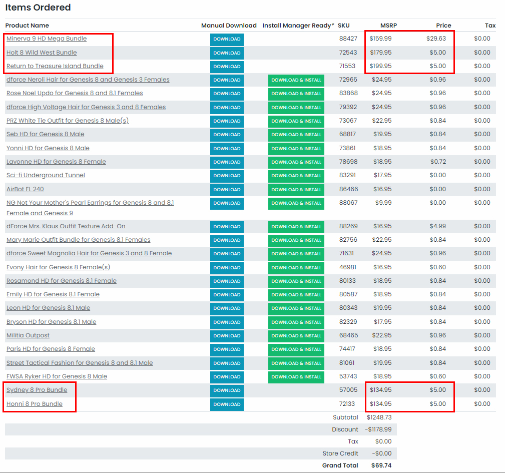Ohne DAZ+ liegt das Bundle bei 70,55 und es kommen dann nochmal 20$ für die vier Einzelbundles dazu. Immer noch eine Menge gespart - aber ich verkneife mir mal die 90 € für andere Zeiten...