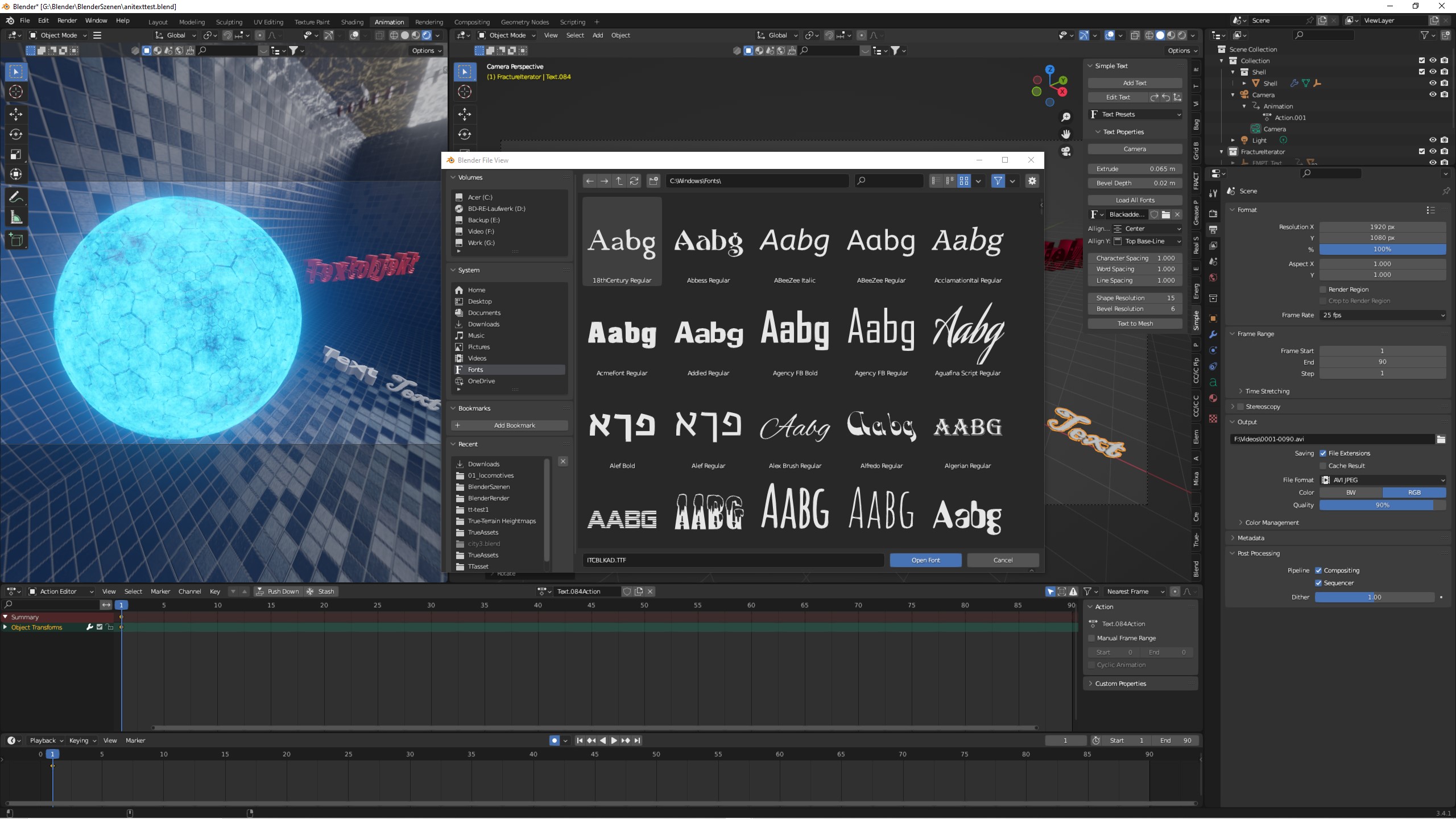 Blender ships with and uses their own font BFont by default. However you most likely want to import a TTF font from your system. You import the font based on the type of text… regular, bold, etc. Simply click the Open icon: