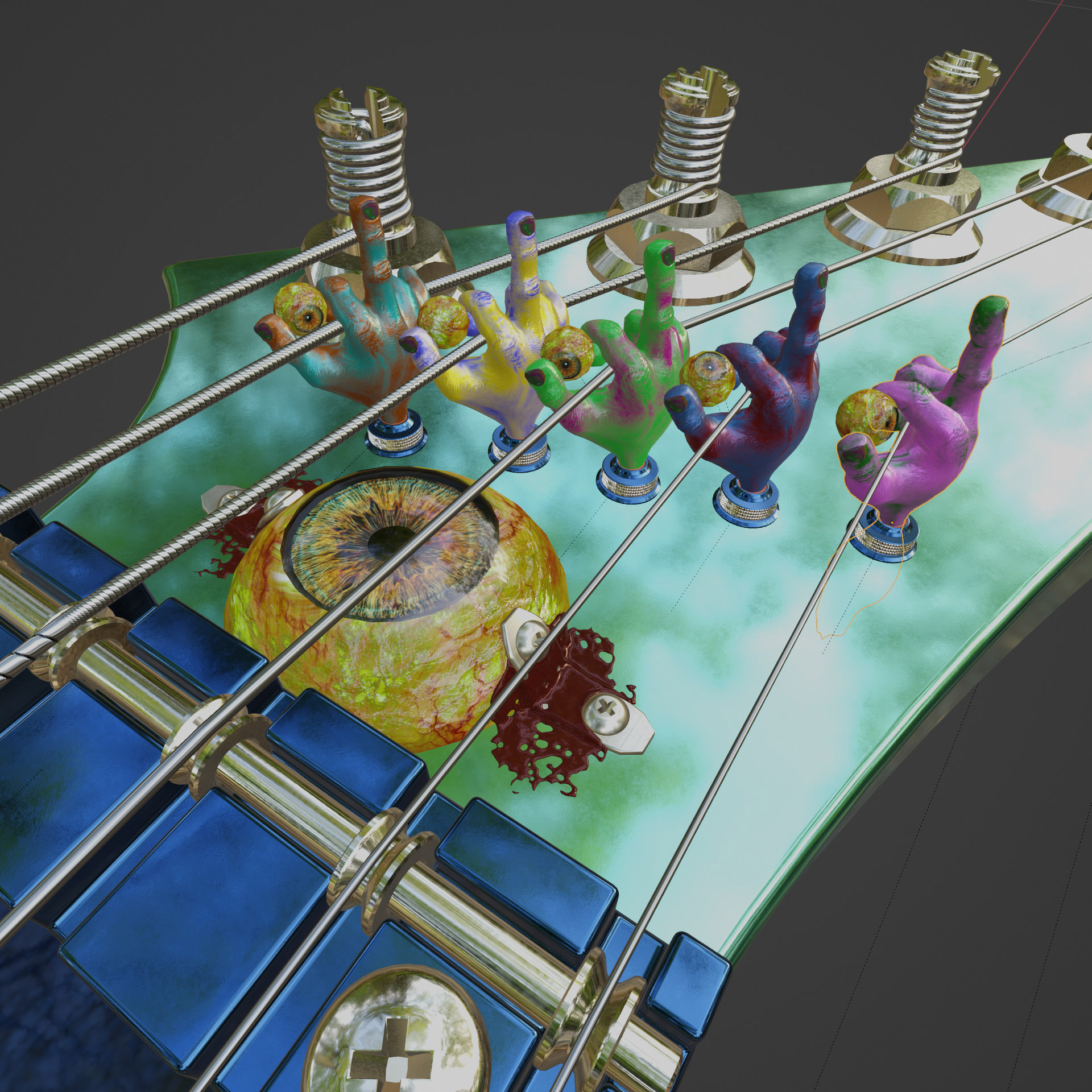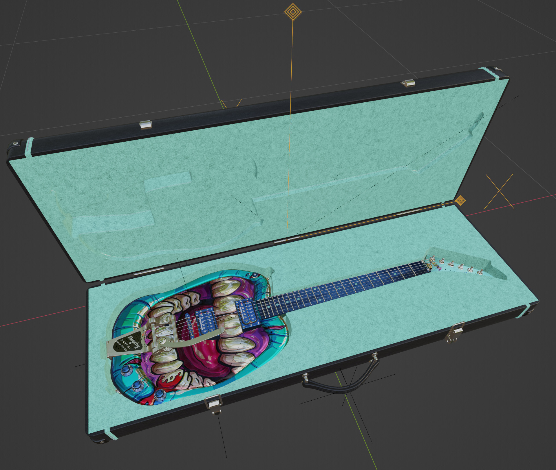 der tremolohebel kan gedreht und gehebelt werden die Spannfeder und die saiten sind animiert. bitte benutze dafür transformation orientation local. so auch für die regler und schalter das diese in winkeln verbaut sind. der gitarrengurt ist im auslieferungs zustand eng an die gitarre angelegt damit er gut in den Koffer passt. bitte mache dich mit Blenders kurven steuerung vertraut dann wird es dir schnell gelingen den gurt vernümdig an deine scene anzupassen. die länge des gurtes wird über den arry modifikator von " starp segment " gesteuert. ich wünsche dir viel spass mit dem modell und mögen deine scenen gelingen.