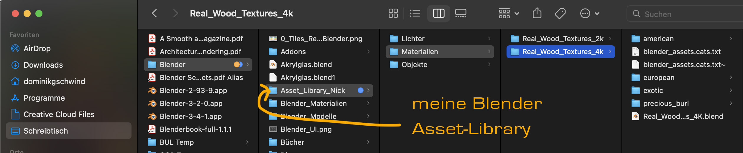 Angehängt seht Ihr einen Screenshot mit dem Finder (Macs File-Explorer), der den Pfad bis runter auf Stufe einzelner Materialbibliotheken zeigt.