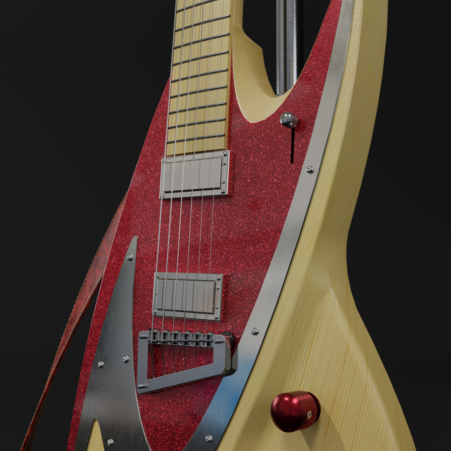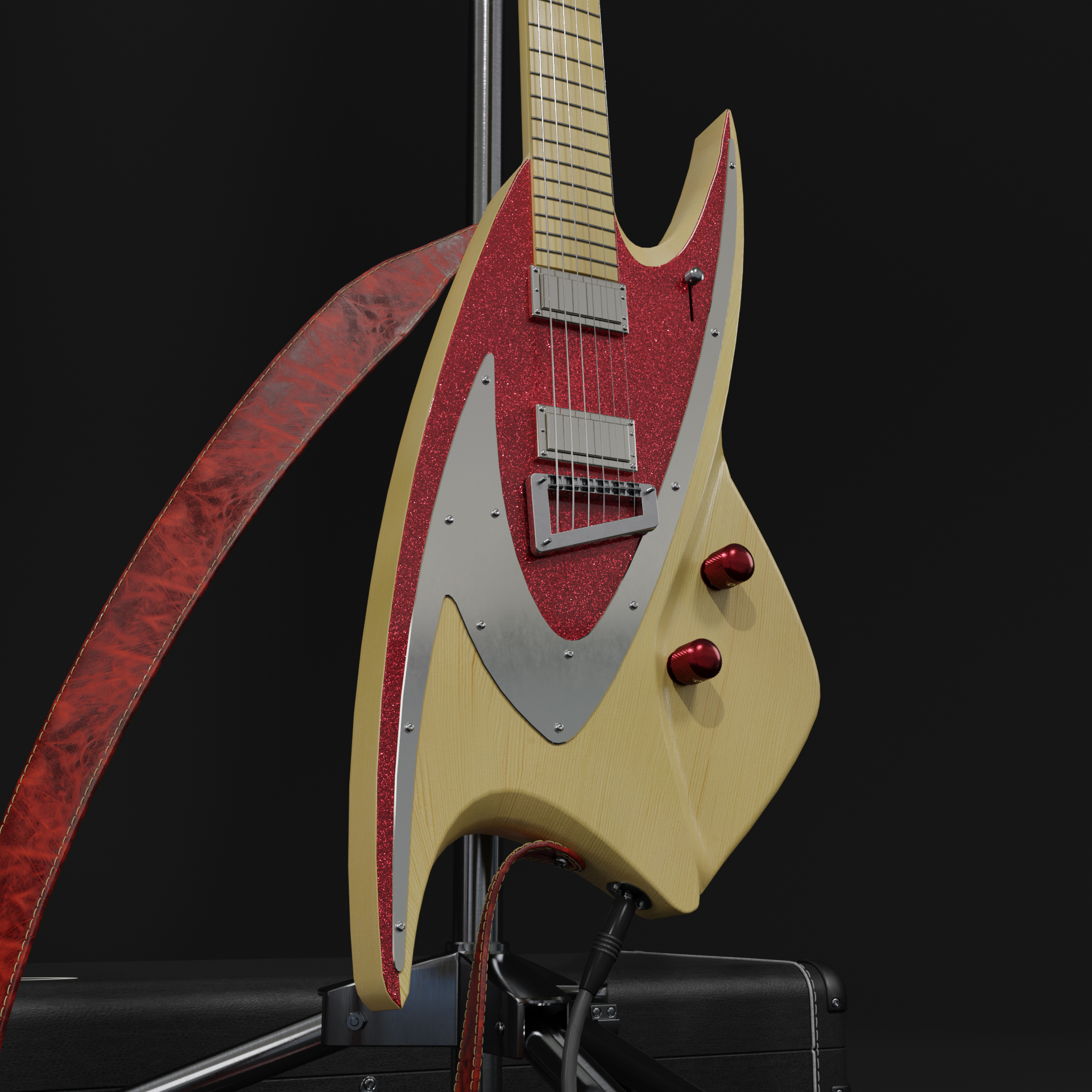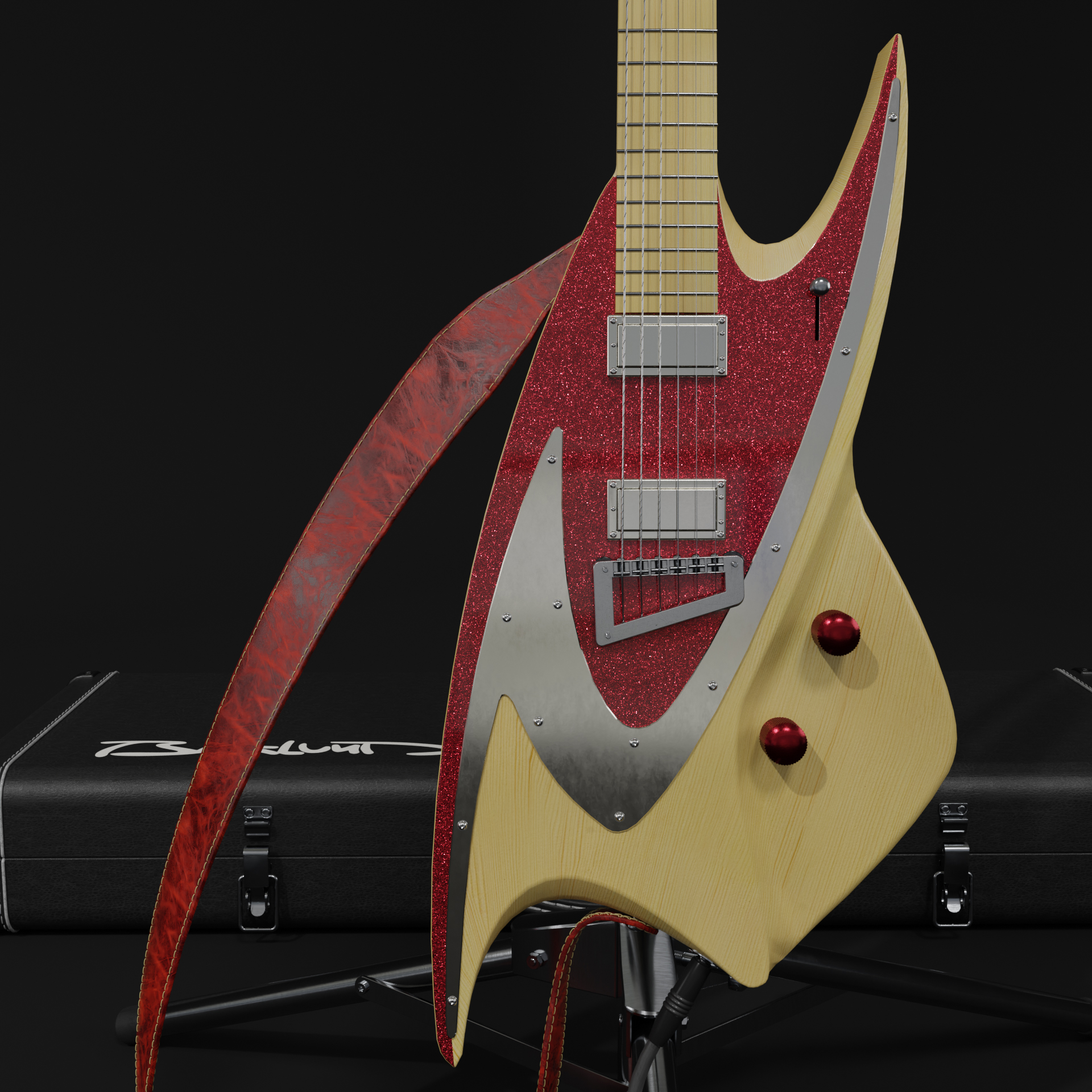 Die Backlund Modell 400 E-Gitarre ist eine einzigartige Gitarre, die von dem schwedischen Designer John Backlund entworfen wurde. Sie hat eine auffällige Form mit einem asymmetrischen Korpus und einem markanten Kopfdesign. Die Gitarre hat eine Mensur von 24,75 Zoll und verfügt über 22 Bünde. Die Modell 400 gibt es in verschiedenen Farben, darunter auch in Natur/Rot. Die Gitarre hat zwei Backlund Humbucker-Tonabnehmer, die einen klaren und kraftvollen Klang liefern. Die Tonabnehmer können über einen 3-Wege-Schalter ausgewählt werden. Die Backlund Modell 400 ist eine hochwertige Gitarre mit einem einzigartigen Design und einem klaren, kraftvollen Klang. Sie eignet sich für eine Vielzahl von Musikstilen, von Rock und Blues bis hin zu Jazz und Fusion. Das Blender Modell wird mit einem hardcase einem dreibein gitarrenständer und einem Gitarrengurt geliefert. du kannst der gitarrengurt mit der steuerkurve strap guiding curve modelieren, die länge des gurtes kannst du mit dem arry modifiezierer von (strap segment) einstellen.
