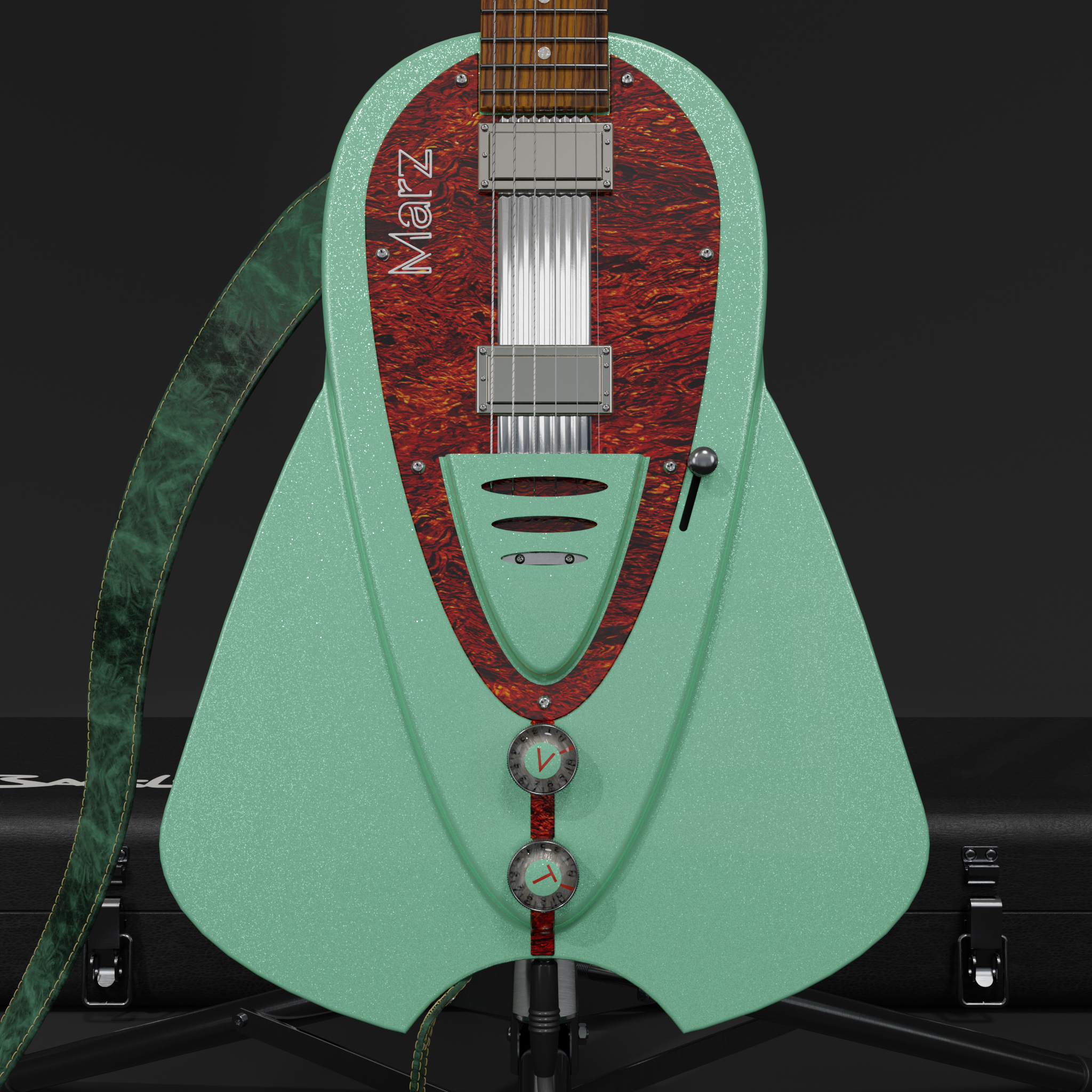 Die Backlund Marz 6 Modell 1100 Gitarre in Grün mit rotem Picguard ist ein einzigartiges und auffälliges Instrument mit einem markanten Design und einem tollen Klang. Die Gitarre wurde vom schwedischen Designer John Backlund entworfen und ist Teil seiner Marz-Serie. Der Korpus der Gitarre besteht aus Linde und hat ein einzigartiges Design . Der Ahornhals hat ein Palisandergriffbrett mit 22 Bünden und einem 25,5-Zoll-Mensur. Die Gitarre verfügt über zwei Humbucker-Tonabnehmer, die einen warmen und klaren Klang mit viel Sustain und Artikulation erzeugen. Der rote Picguard verleiht der Gitarre einen auffälligen Look, der von vielen Gitarristen geschätzt wird.