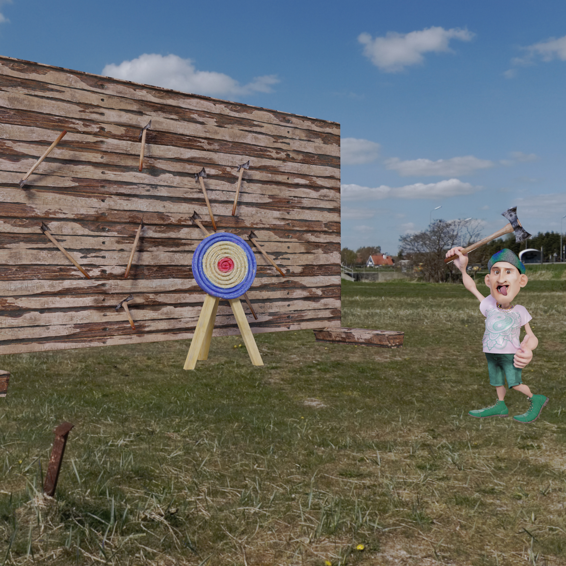 Ich hab dann noch schnell eine Schutzwand und ne Zielscheibe aufbauen können bevor es zu einem Unfall gekommen ist und Sie ermutigt wenigsten hin zu schauen wenn sie wirft aber nein der kleine Dickkopf kopiert einfach eine Axt nach der anderen und wirft während Sie sich mit rausgestreckter Zunge versucht mit mir zu unterhalten! hätte ich bloß diese Axt zu Blenderkit geschickt und nicht noch auf Bertas Nachbar Partition gespeichert!