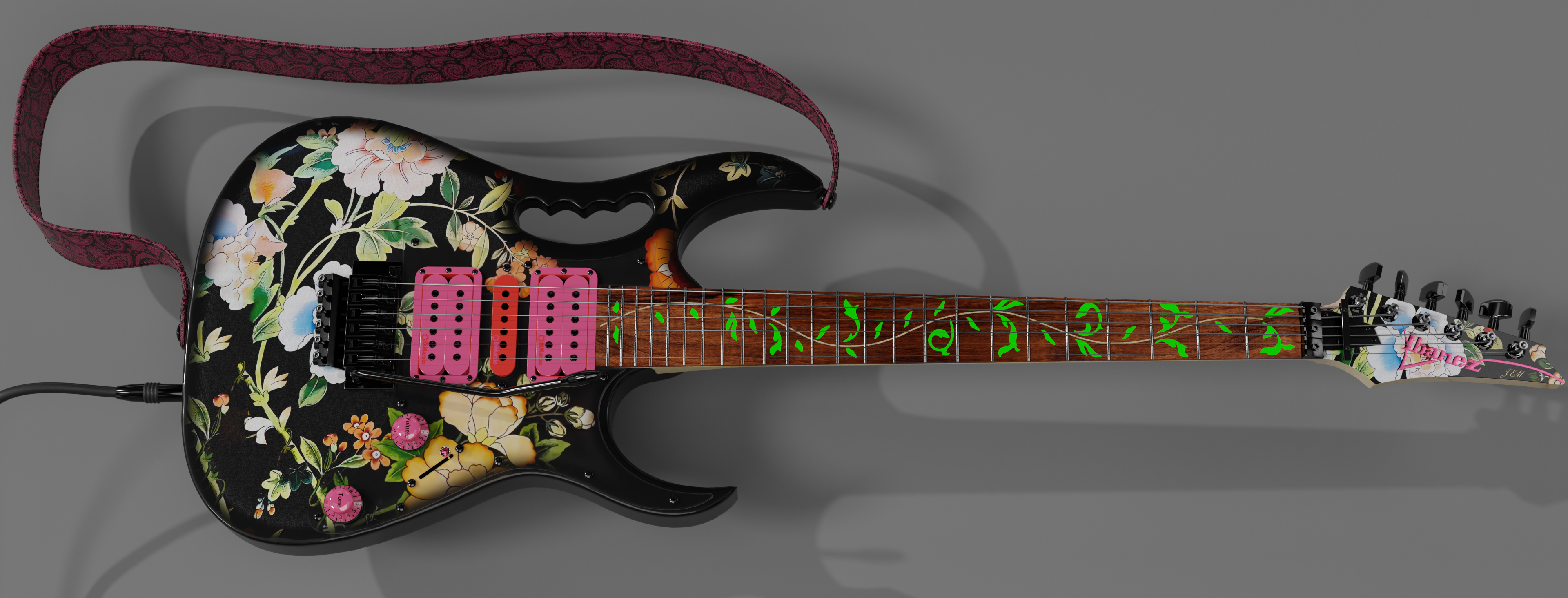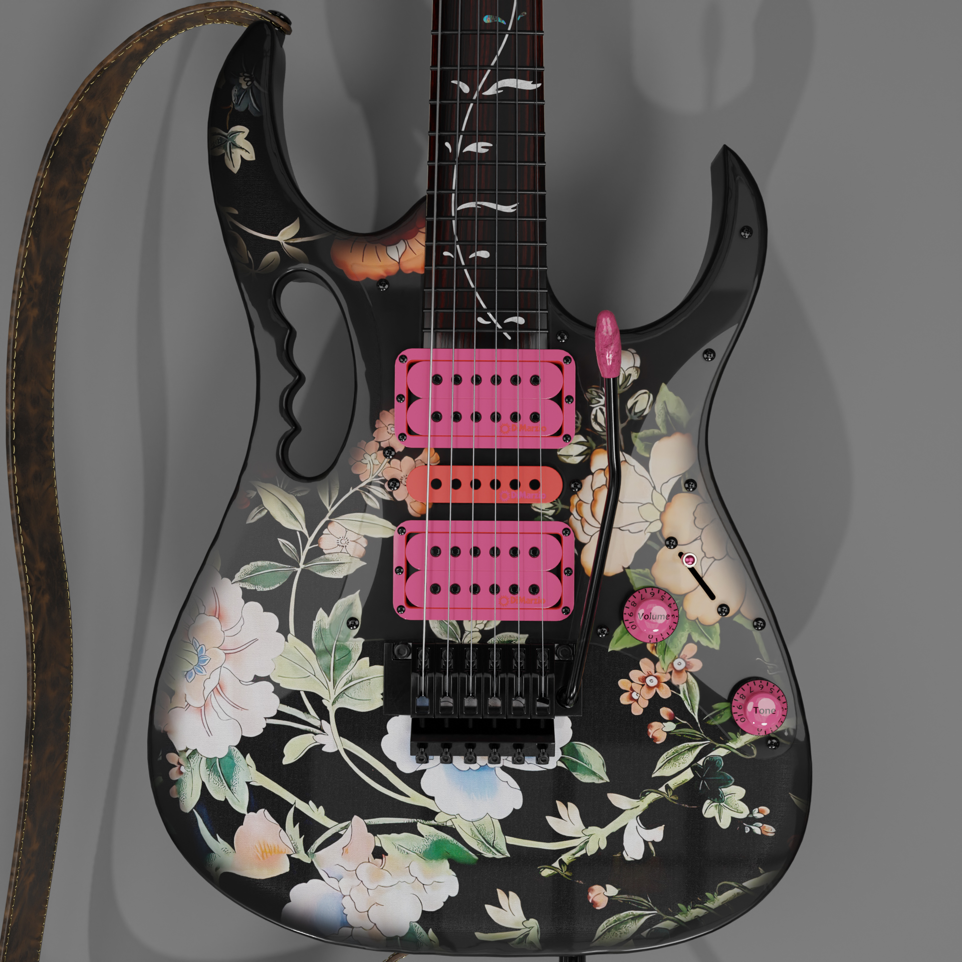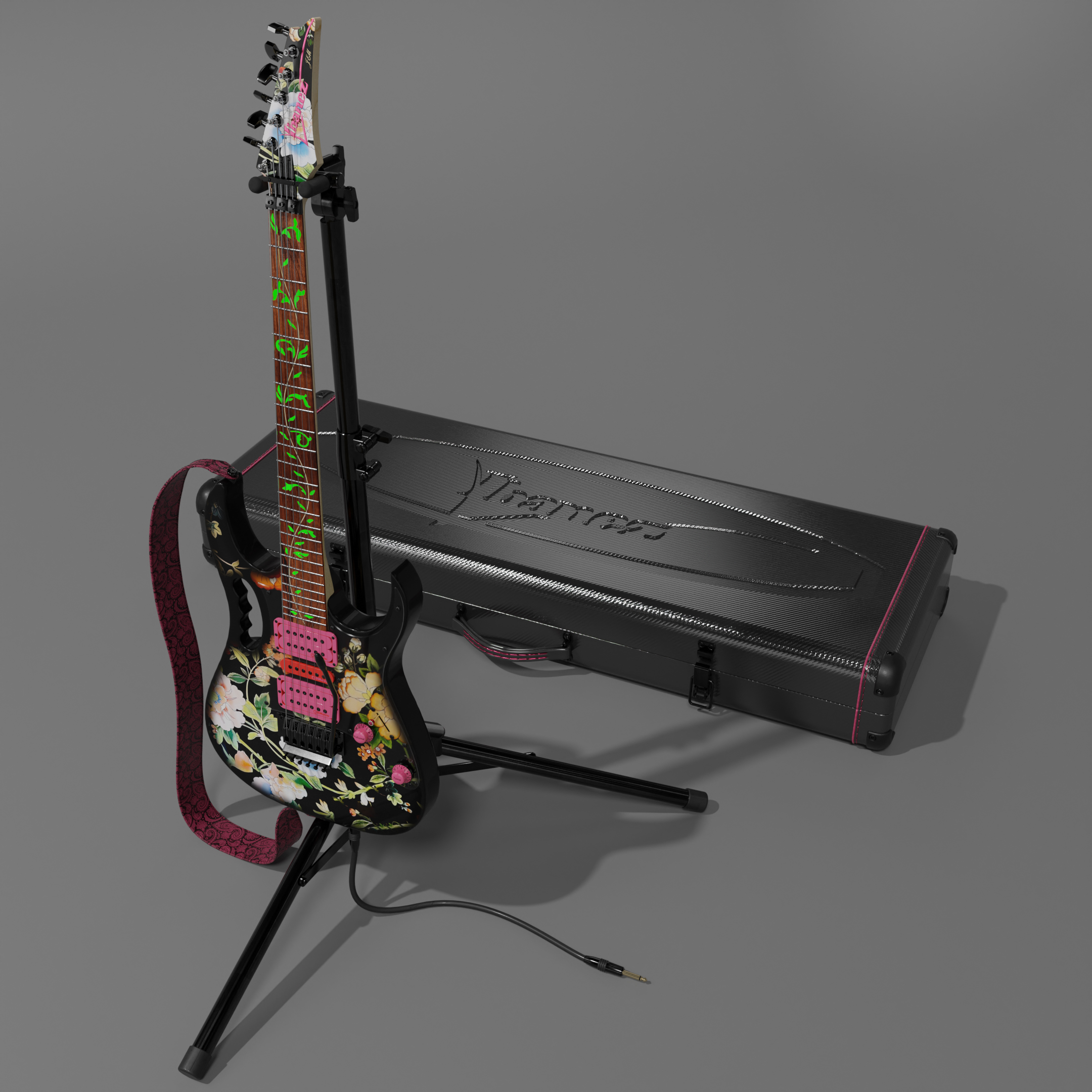 the JEM77 FP (Floral Pattern), is a JEM series solid body electric guitar model introduced by Ibanez in 1988. It is a signature model produced for American guitarist Steve Vai. With this guitar model by Ibanez / Steve Vai, the manufacturer has inserted textile fabric with a print designed by Jay Yang in 1988 into the lacquer layer and finished with a glossy clear lacquer. Such a music apparatus is traded as a year of construction 2002 (last year of production) for 7000 to 7800 €. I have tried to replicate the textual character of the template as closely as I can. I implemented this by restoring the available reference material and using a canvas texture as a normal map. this normal map alone is already 24 megabytes in size. the color and normal map are faded towards the edge with a B/W mask into a deep black without a normal map .a treat for every Vai fan. as in the original I use a transparent pickguard and pink, red pickups from Dimarzio and switshes. I let a bit of artistic freedom work on the switch. the guitar case is equipped with fur that is controlled with a driver and is not generated when the case is closed. when the case is opened, the particle systems are automatically activated and fur develops. you can model the guitar strap with the control curve and you can adjust the length of the strap with the arry modifier from (stap segment).