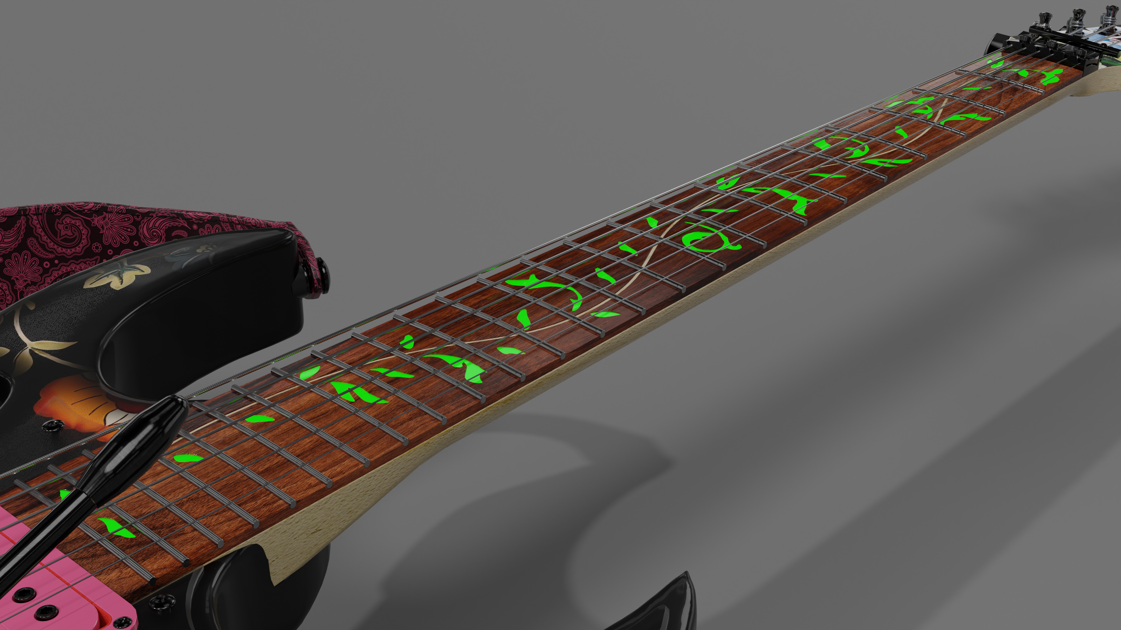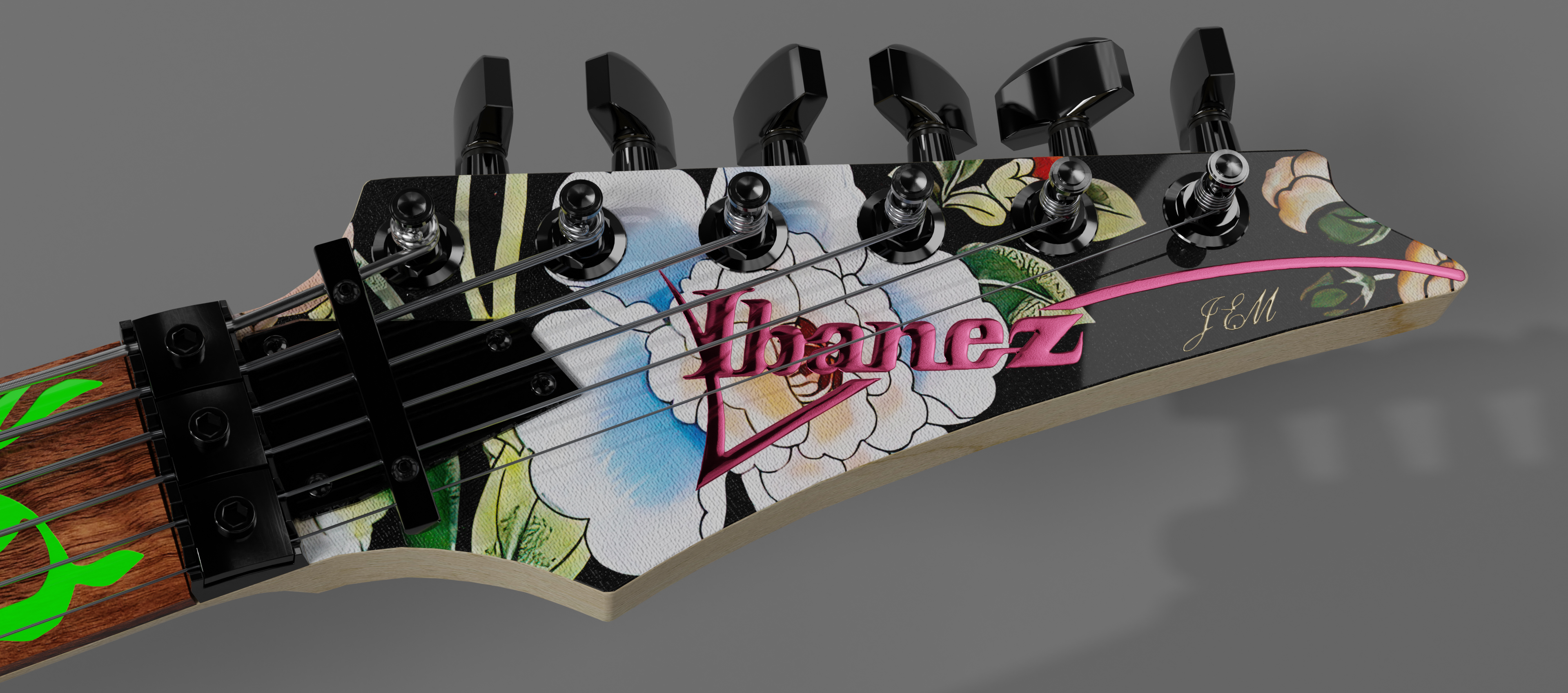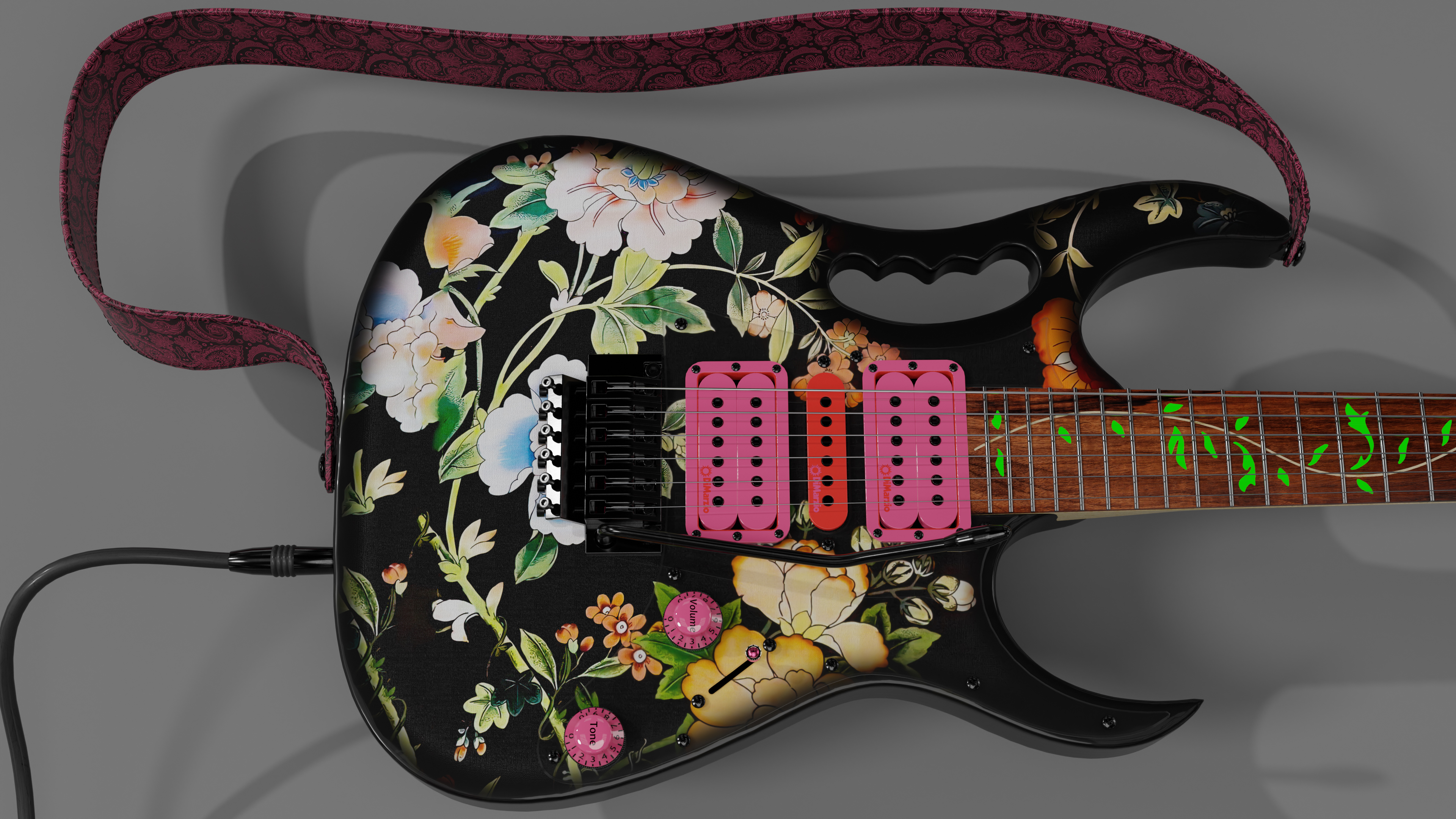 the JEM77 FP (Floral Pattern), is a JEM series solid body electric guitar model introduced by Ibanez in 1988. It is a signature model produced for American guitarist Steve Vai. With this guitar model by Ibanez / Steve Vai, the manufacturer has inserted textile fabric with a print designed by Jay Yang in 1988 into the lacquer layer and finished with a glossy clear lacquer. Such a music apparatus is traded as a year of construction 2002 (last year of production) for 7000 to 7800 €. I have tried to replicate the textual character of the template as closely as I can. I implemented this by restoring the available reference material and using a canvas texture as a normal map. this normal map alone is already 24 megabytes in size. the color and normal map are faded towards the edge with a B/W mask into a deep black without a normal map .a treat for every Vai fan. as in the original I use a transparent pickguard and pink, red pickups from Dimarzio and switshes. I let a bit of artistic freedom work on the switch. the guitar case is equipped with fur that is controlled with a driver and is not generated when the case is closed. when the case is opened, the particle systems are automatically activated and fur develops. you can model the guitar strap with the control curve and you can adjust the length of the strap with the arry modifier from (stap segment).