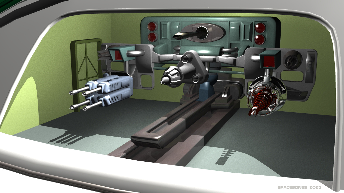 Nu ja, in unbekannten Gefilden muss man manchmal auf böse Überraschungen vorbereitet sein. Die beiden Waffenphalanxen befinden sich beidseitig in der oberen Kuppel und sind im Normalbetrieb diskret verborgen. Bei Bedarf werden sie auf einer Katapultschiene ausgefahren.