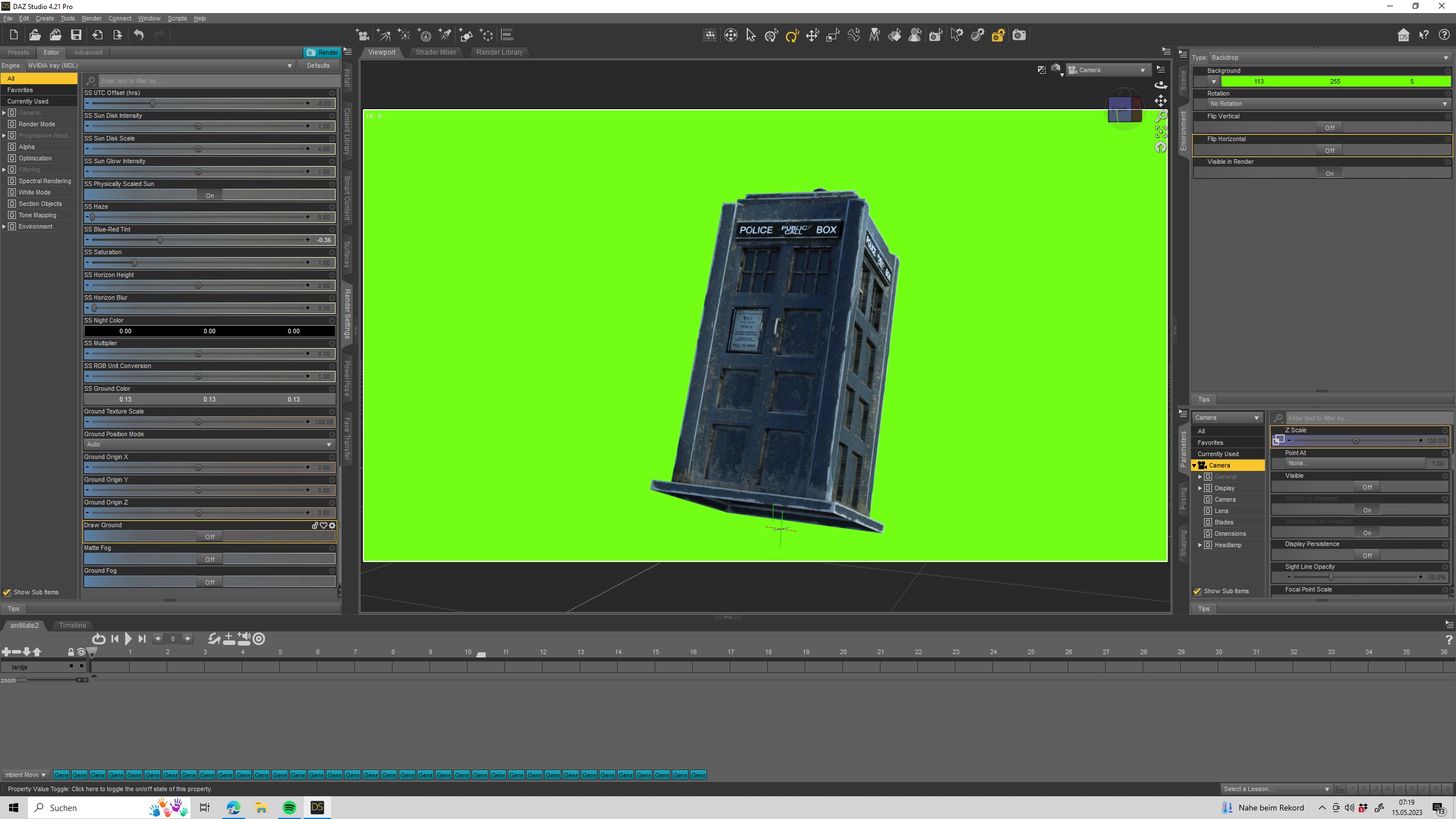Schritt :Tardis importieren nach Daz 3d ,einen grünen Enviroment erstellen,beim Rendersetting,auf Ground OFF stellen ....