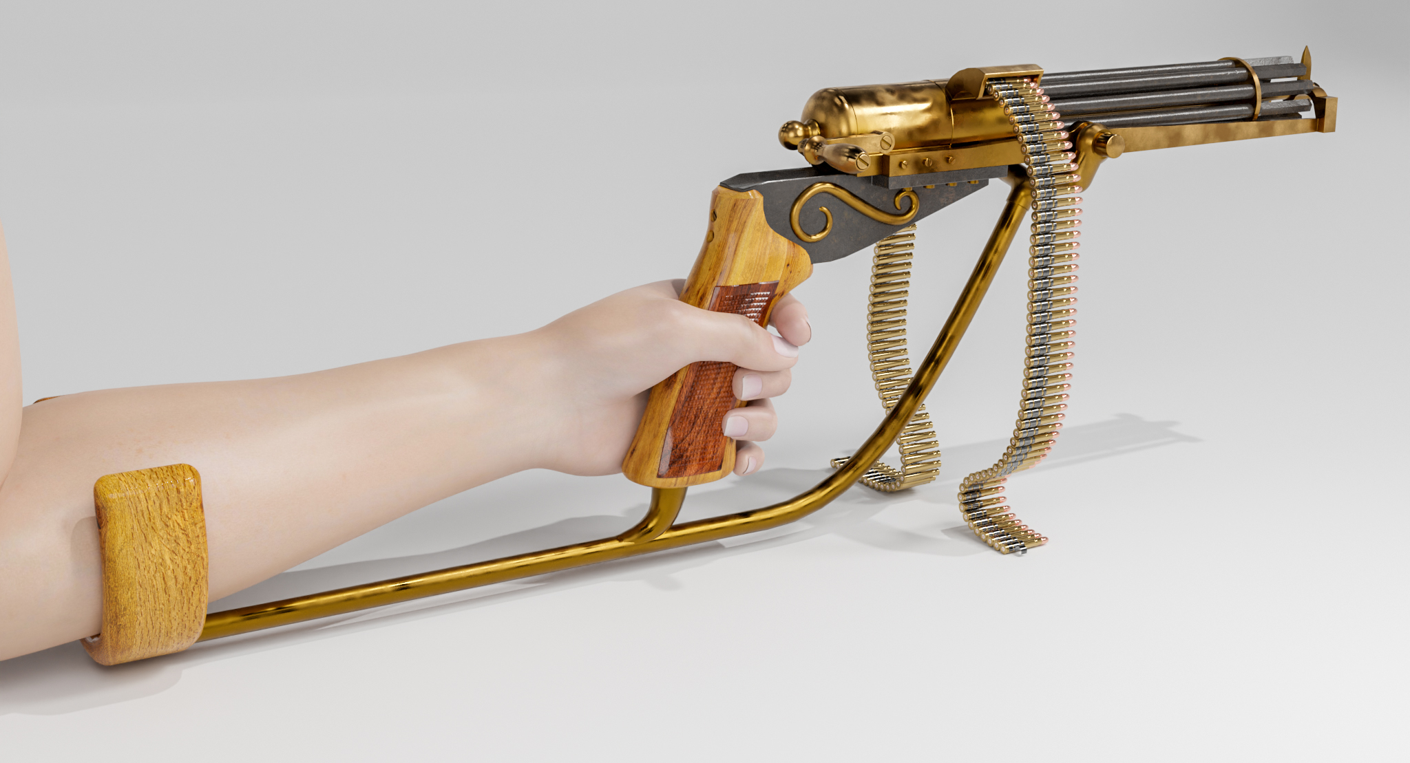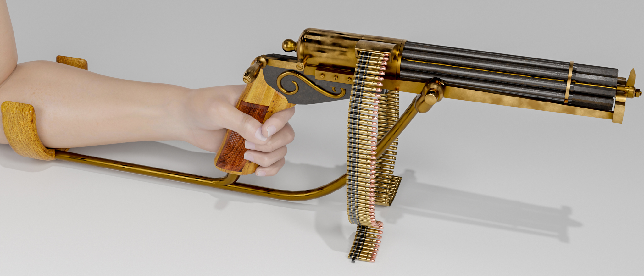ich glaub das geht mit einer 9 mm kleinkalieber Patrone Die Firma TIPPMANN Armory stellt eine Gatling Gun 9mm para her die ungefähr in der größe eines 45er Colt Magnum Revolver ist! hab ich gerade gelesen.