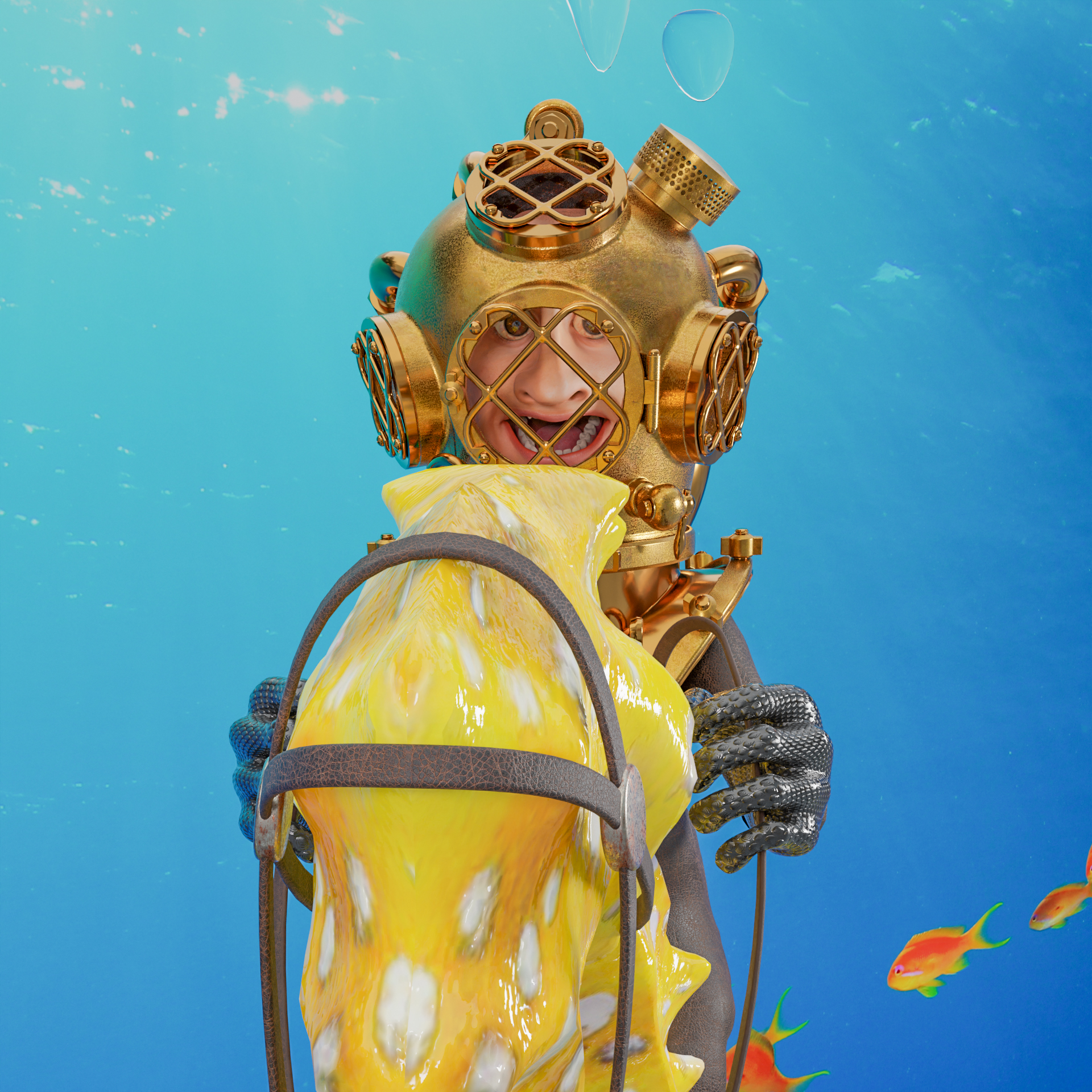 Ooh mein Gott.....die arme Berta. Das Teil ist doch außerdem auch ziemlich schwer. Vielleicht spendierst Du ihr noch eine stylische Sauerstoffflasche mit Mundstück und Taucherbrille. -