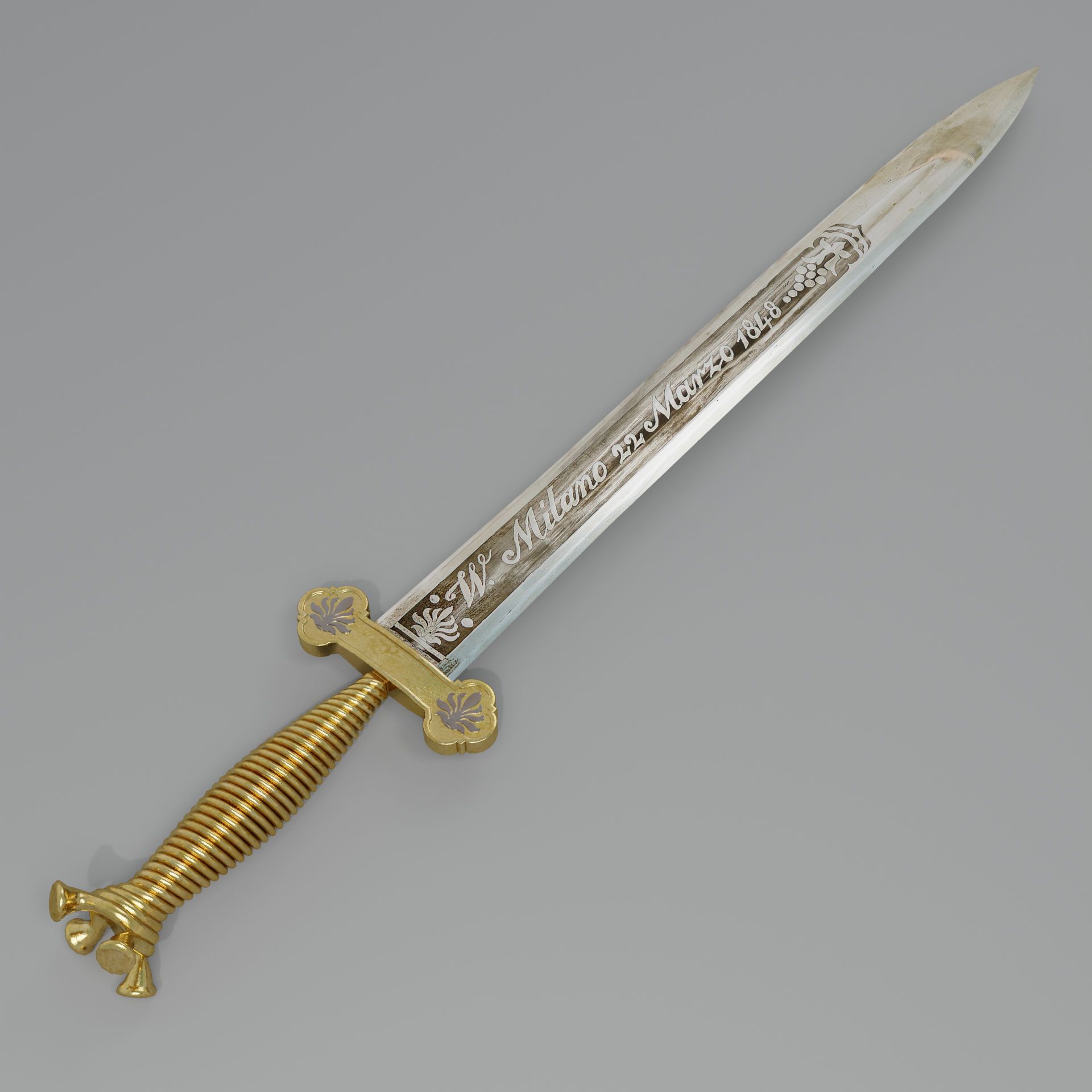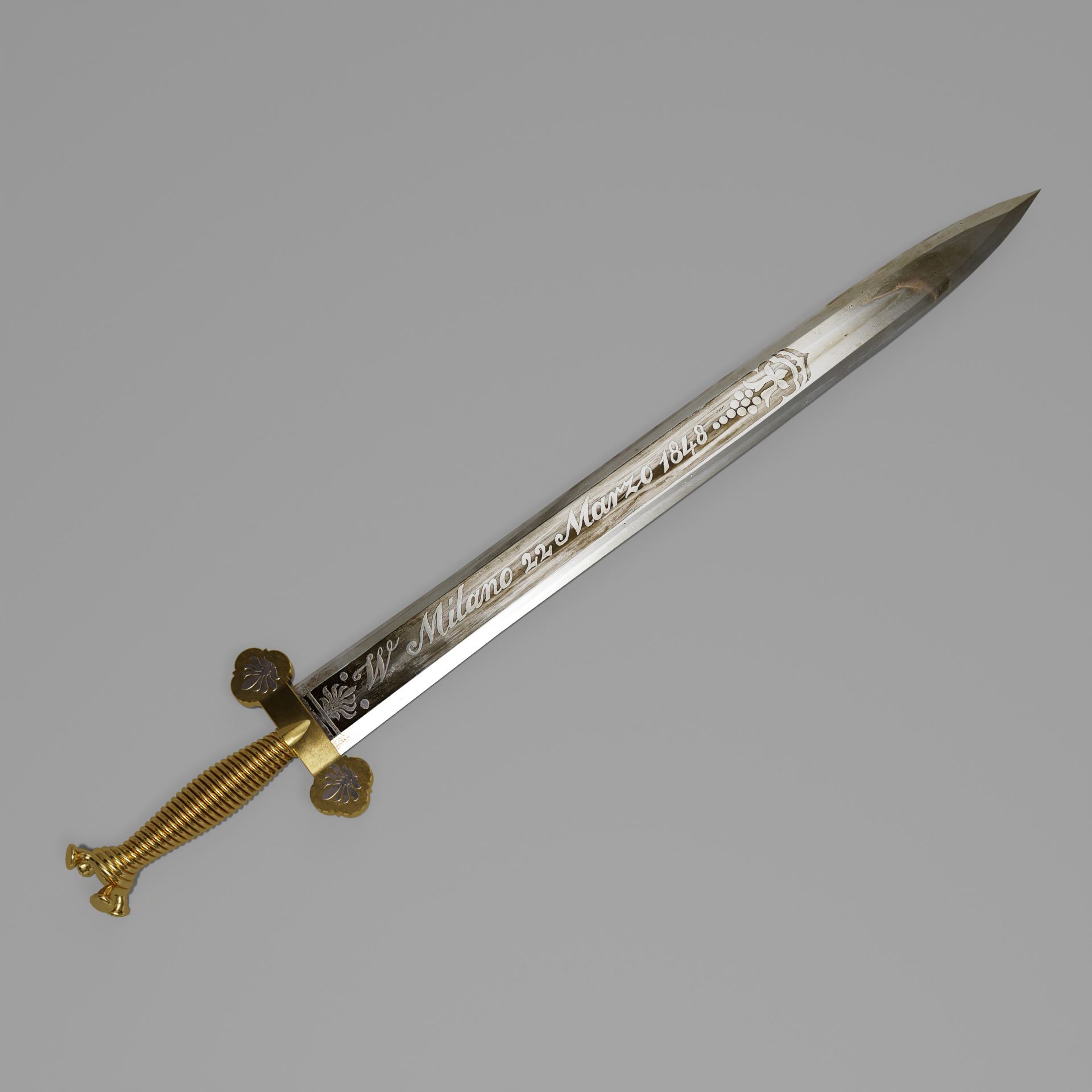 Ein Schwert, das als scharfe Waffe bezeichnet wird. Es stammt aus Italien und ist auf das Jahr 1848 datiert. Auf der Klinge des Schwertes befindet sich eine Inschrift mit der Ortsangabe „W Milano“ und dem Datum „22 Marzo 1848“. Eine Blankwaffe ist eine Waffe, die keine Schusswaffe ist, sondern durch direkten Kontakt mit dem Gegner eingesetzt wird. Beispiele für Blankwaffen sind Schwerter, Dolche oder Äxte. Die Datierung eines Objekts gibt das Jahr an, in dem es hergestellt oder verwendet wurde. In diesem Fall ist das Schwert auf das Jahr 1848 datiert, was bedeutet, dass es in diesem Jahr entweder hergestellt oder verwendet wurde. Die Inschrift auf der Schwertklinge nennt den Ort „W Milano“, was vermutlich für „in Milano“ steht und somit auf den Herstellungsort des Schwertes hinweist. Das Datum „22 Marzo 1848“ weist auf den 22. März 1848 als mögliches Herstellungsdatum hin oder kann mit einem historischen Ereignis an diesem Tag in Zusammenhang stehen.