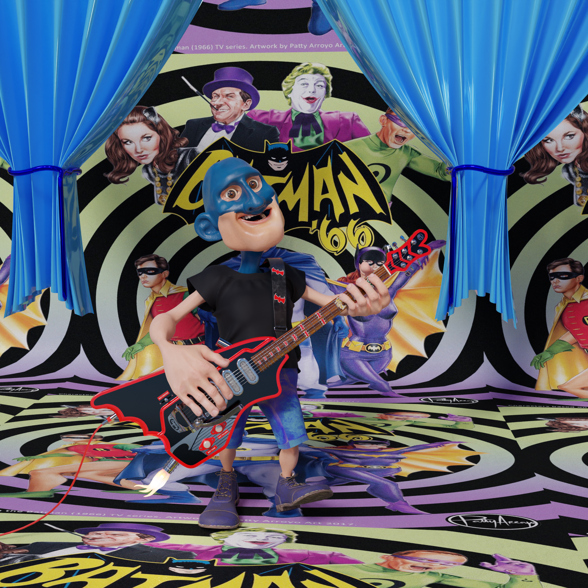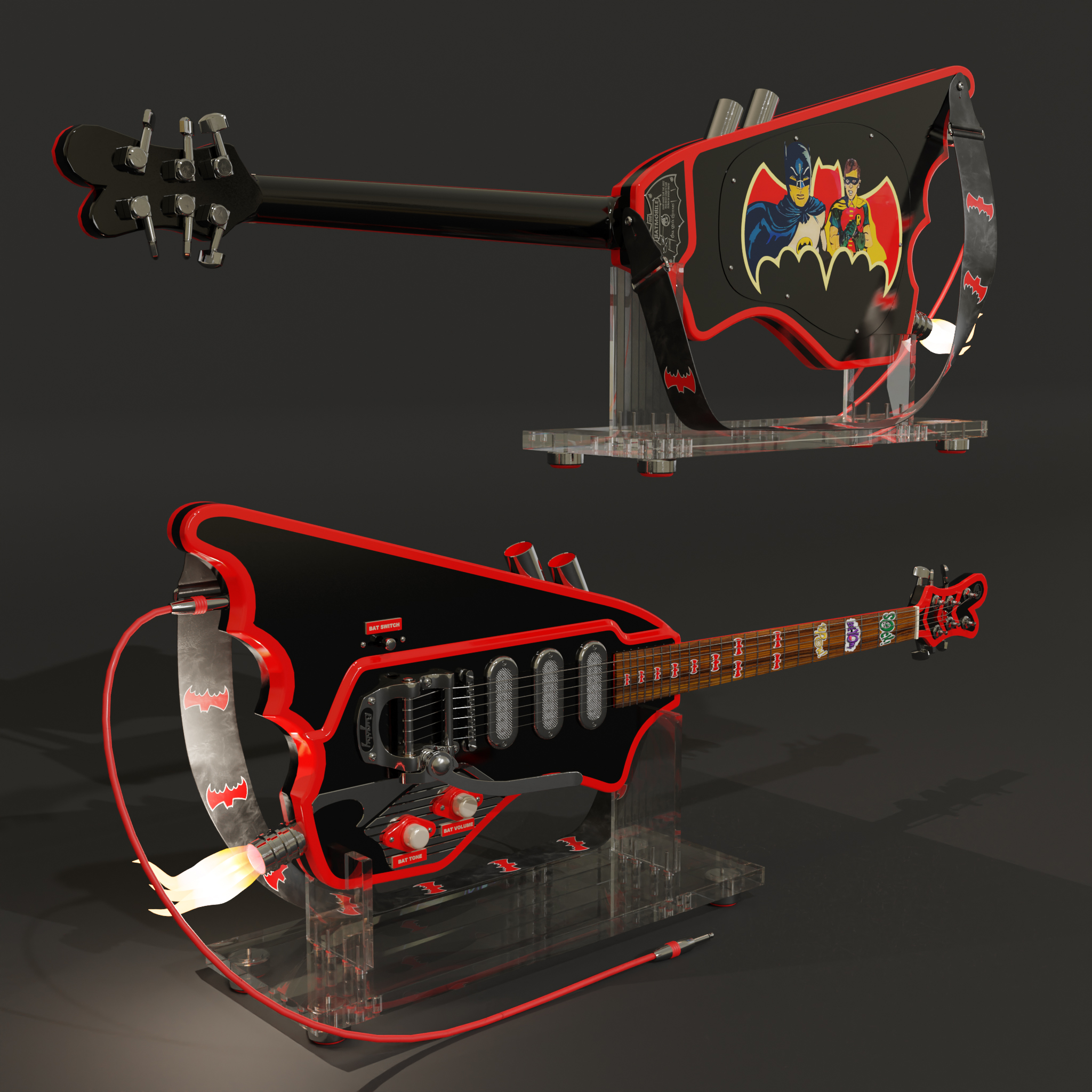 Diese einzigartige E-Gitarre wurde von Oak Creek Guitars in San Diego, Kalifornien, für die San Diego County Fair Design in Wood Show 2022 hergestellt. Diese Gitarre wurde als Hommage an George Barris' Batmobil von 1966 gebaut und sieht nicht nur umwerfend aus, sondern spielt sich mit drei handgewickelten Humbucker-Tonabnehmern, superweicher Mechanik und halbkugelförmigen Bundenden auch hervorragend! Ein lustiges Stück, egal in welcher Situation. Gitarrenfan großartig, Comic-Fan sogar noch besser. Diese Gitarre hat ein Geheimnis: Sie verfügt über eine funktionierende Feuerturbine, genau wie das echte Batmobil. Ein Kronjuwel für jede Sammlung. Die Restaurierung des spärlichen Referenzmaterials hinsichtlich der Maßstabsmarkierungen und der übrigen Bildteile war mit viel Arbeit verbunden. Aber bei solch einer beeindruckenden Gitarre hat sich jede Arbeitsstunde gelohnt. Die Gitarre wird mit einem Gitarrendisplay zur Präsentation, einem Verbindungskabel und einem Gitarrengurt geliefert. Sie können die Länge des Riemens mit dem Arry-Modifikator anpassen und ihn mit der Kontrollkurve modellieren. Die mitgelieferten Flammen habe ich aus Mesh modelliert, so dass man auch statische Bilder machen kann, aber man kann diese Flamme auch mit Hilfe eines Formschlüssels animieren. Ich wünsche Ihnen viel Spaß mit diesem tollen Sammlerstück und mögen Ihre Szenen gelingen.
